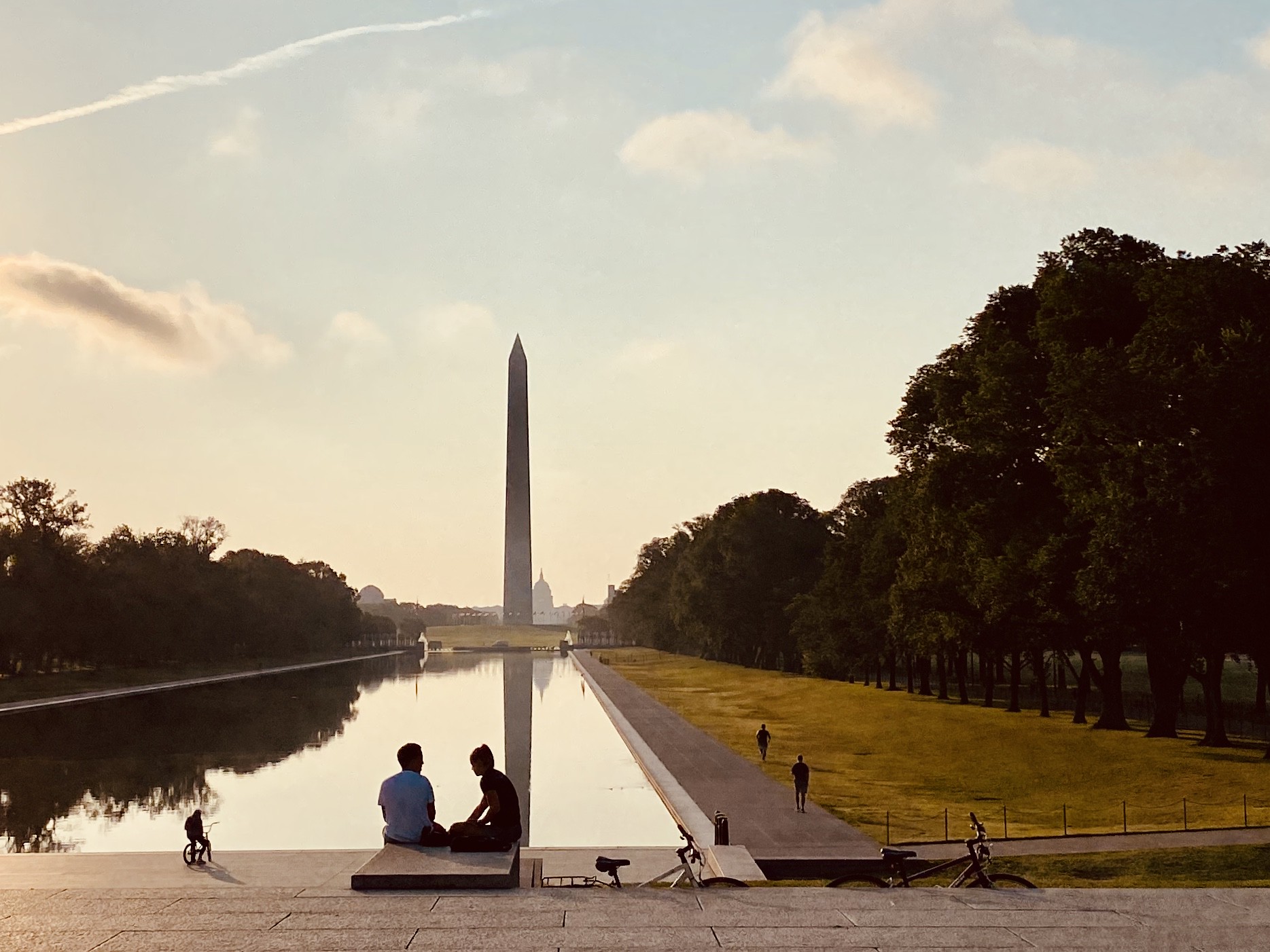 Two parents on a bench at the Rose Park tot lot as a dozen or so tourists struggle up the path on Bikeshare bikes: