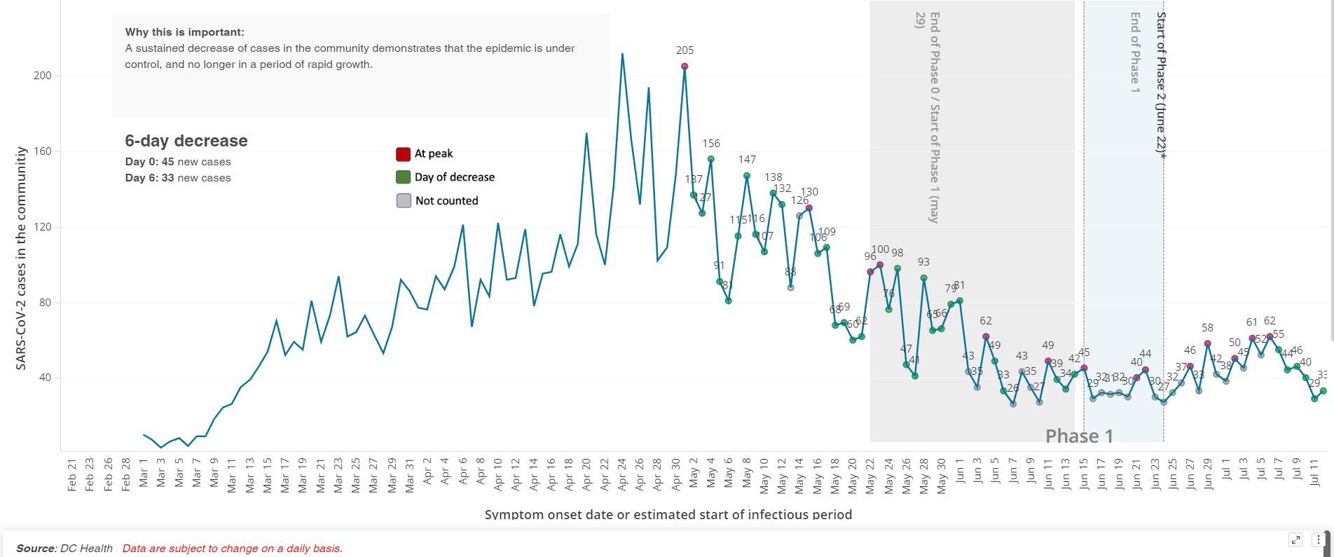 D.C. measures “sustained decrease in cases in the community,” or “community spread,” by counting “days of decrease.” A “day of decrease” is when the number of new cases is “less than 2 standard deviations from the 5-day rolling average from the previous low; or there are NOT three days of consecutive increase.”