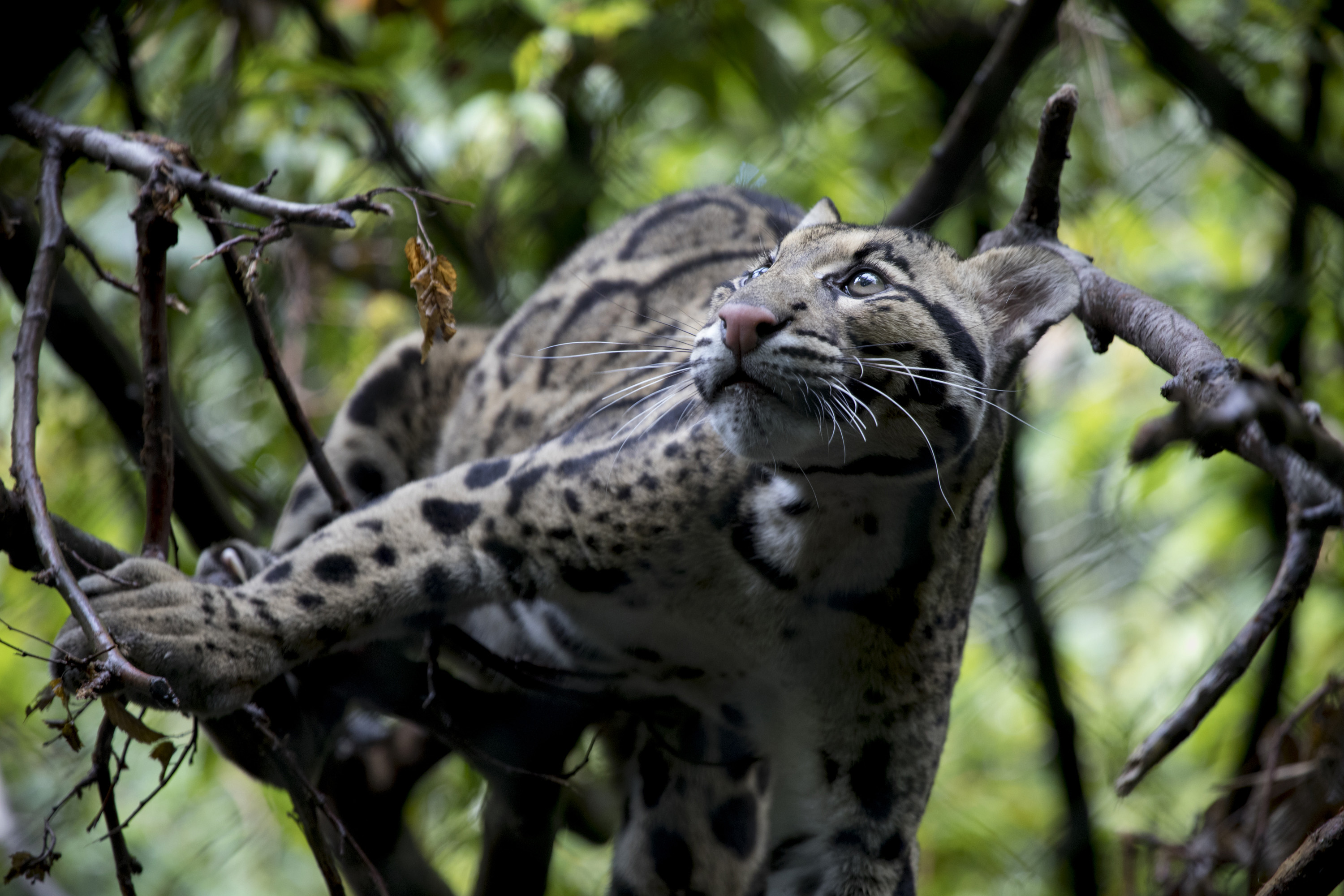 A juvenile clouded leopard climbs in a tree within its habitat at the National Zoo on the first day of the zoo’s re-opening.