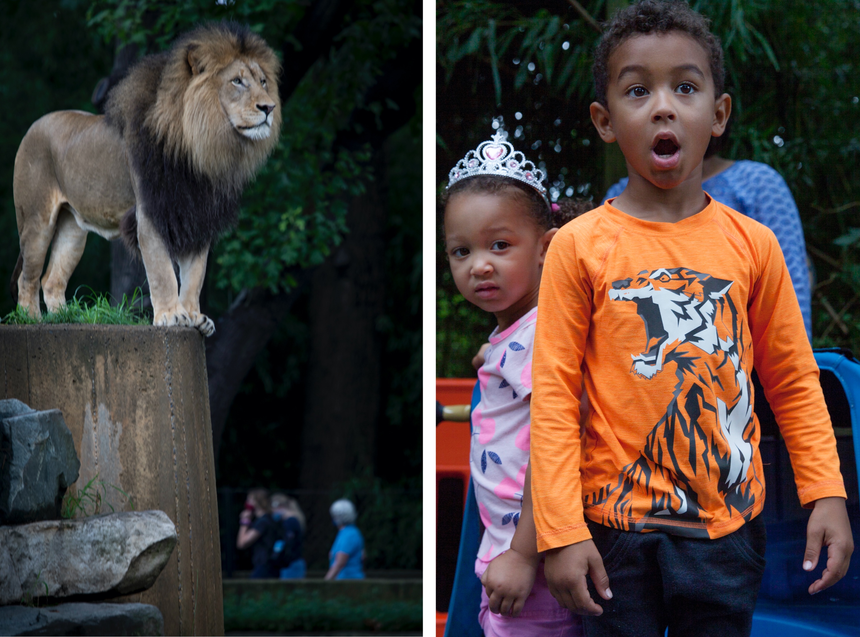 Photo on right—John Lee, 5, a lion and tiger fan, reacts to one of the big cats as his sister, Rachel Lee, peeks out from behind him. They live in Burke, Va. Photo on left—one of the male lions stands tall in his habitat as masked zoo-goers pass by.