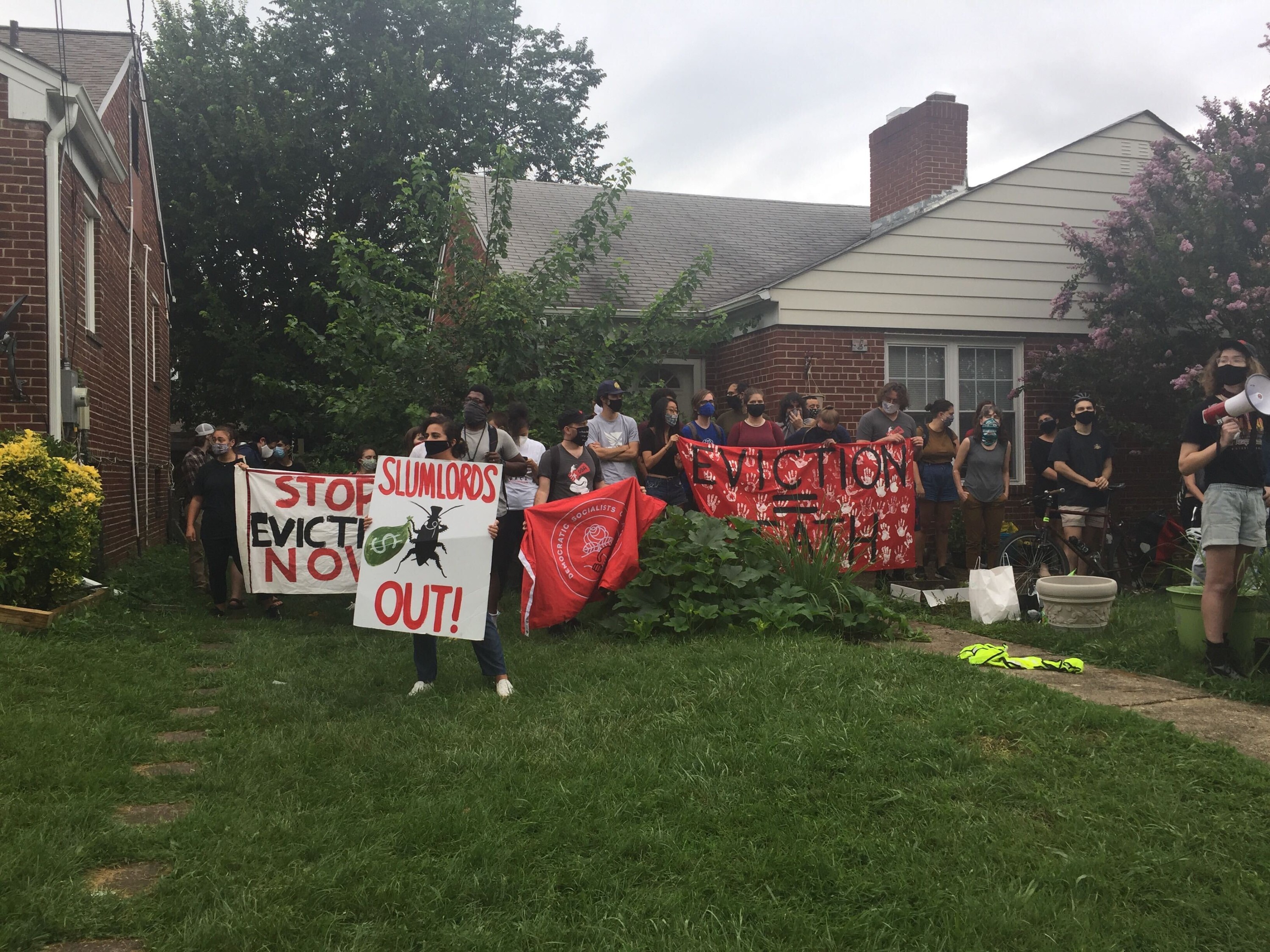 On Friday afternoon, dozens of demonstrators, wearing masks and carrying signs with slogans like “Slumlords out!” and “Cancel evictions now!” gathered on the front lawn and stationed themselves at all the doors to the home while the tenants retreated inside. The quiet dead-end street rang with chants of “When our homes are under attack, what do we do? Stand up, fight back!” and “Housing is a human right! Fight, fight, fight!”