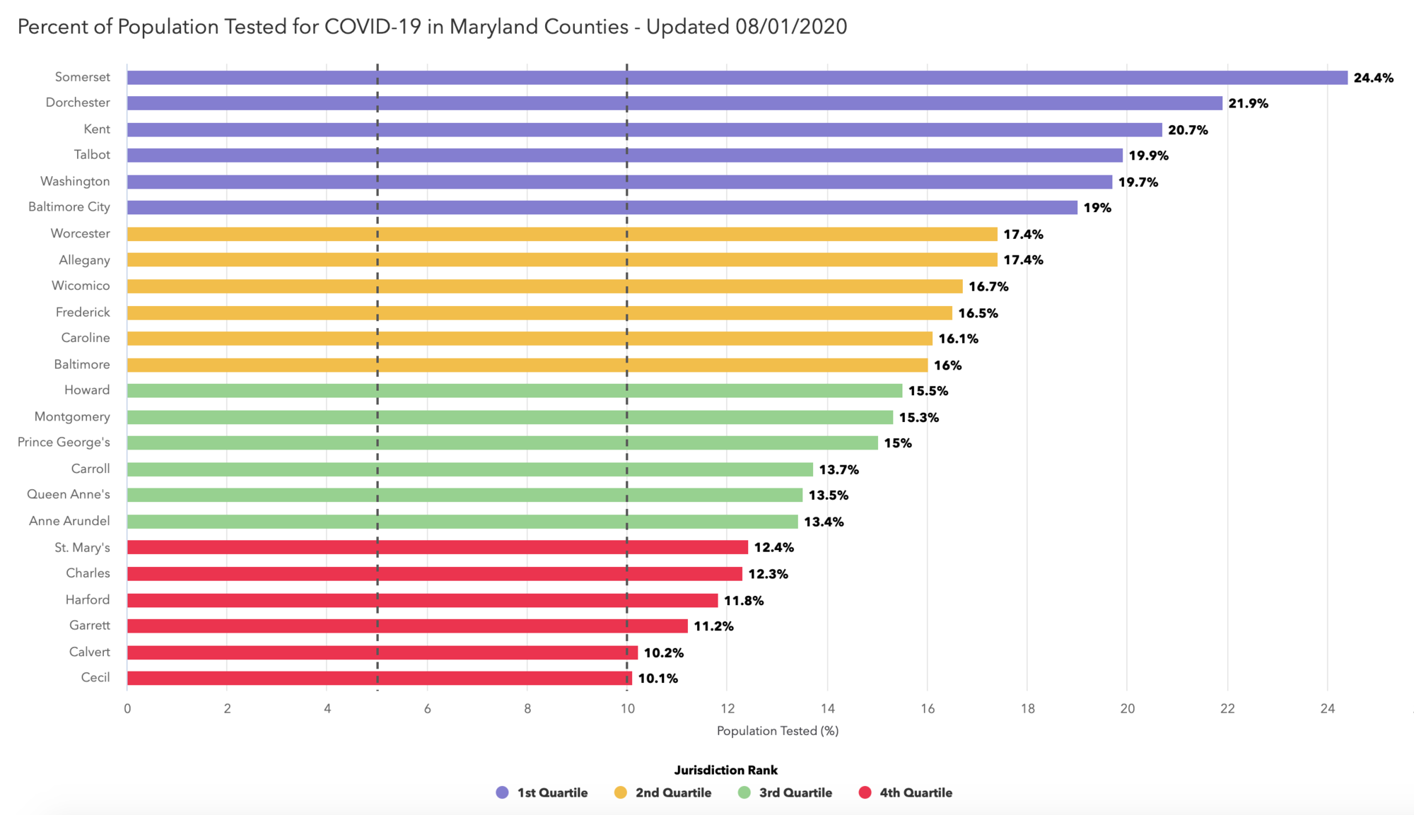 “Our aggressive statewide testing strategy is helping us understand, identify, and stop the spread of this virus, and I want to commend all of our local jurisdictions for stepping up to meet our goal of testing 10% of their population,” Gov. Larry Hogan said in a press release.