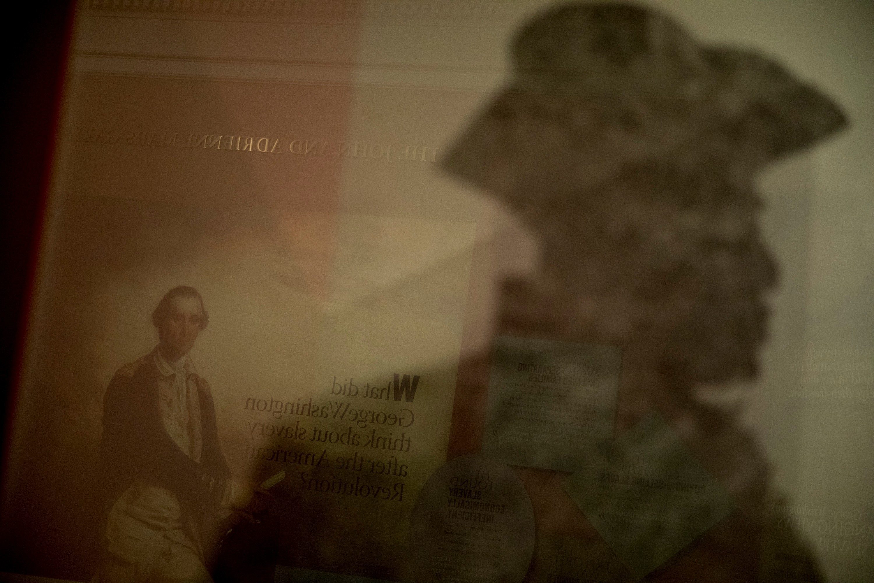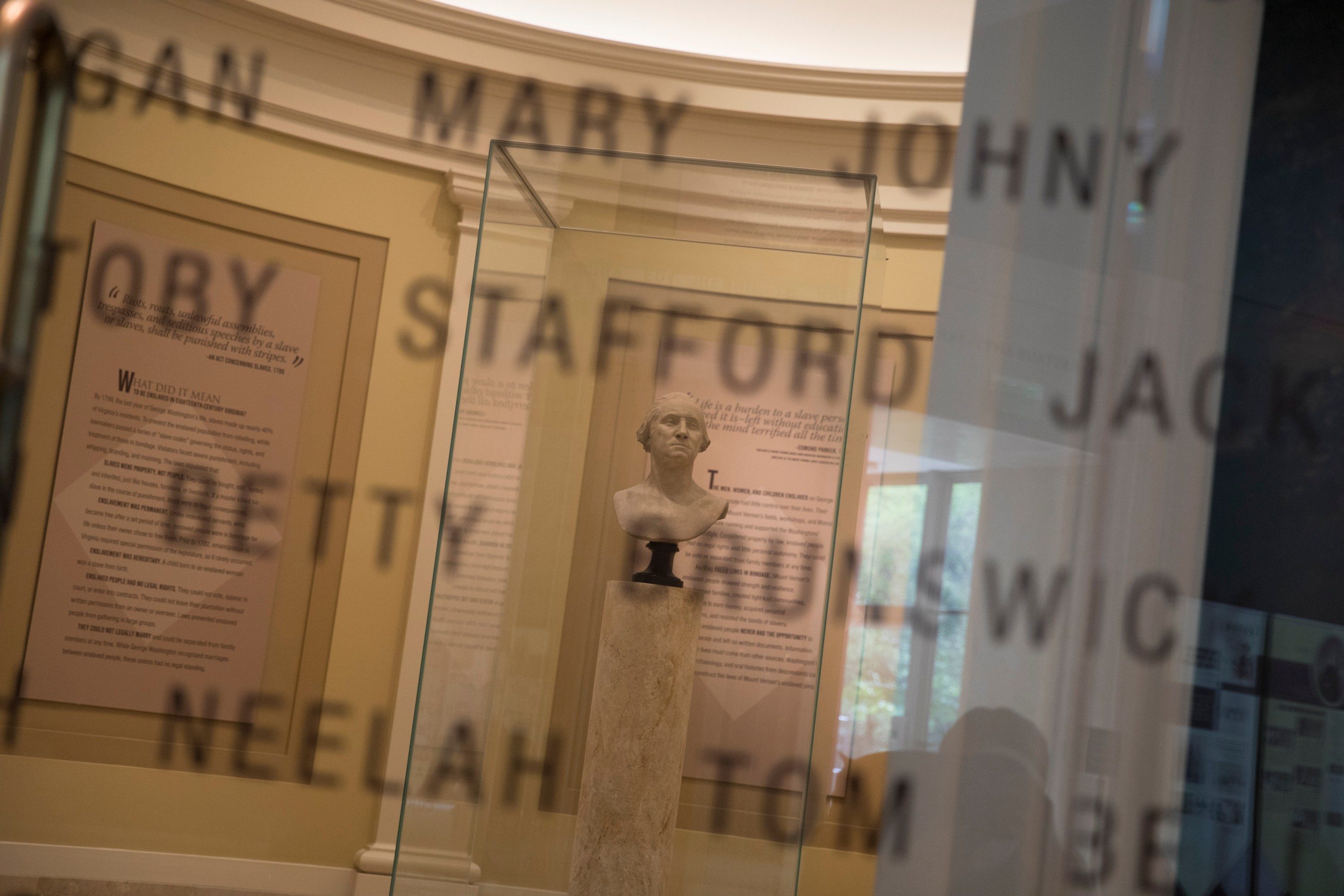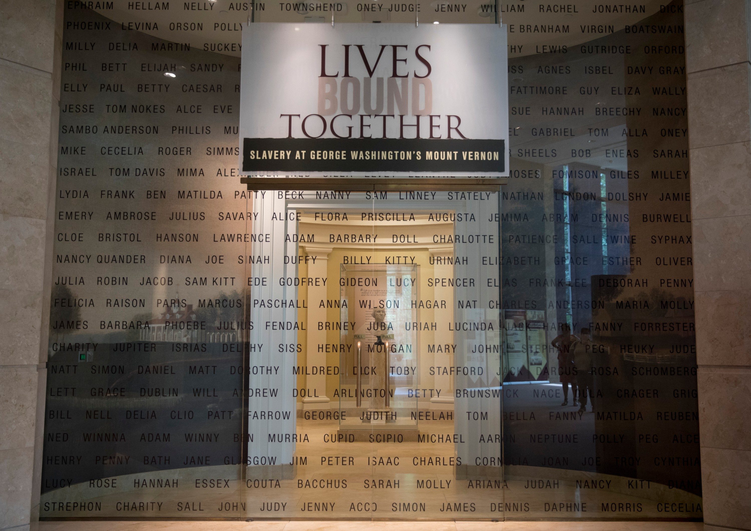 The first thing you’ll see when visiting the exhibit is a massive glass entrance emblazoned with the names of hundreds of people formerly enslaved at Mount Vernon. Visible directly through the inscribed glass is a bust of America’s first president.