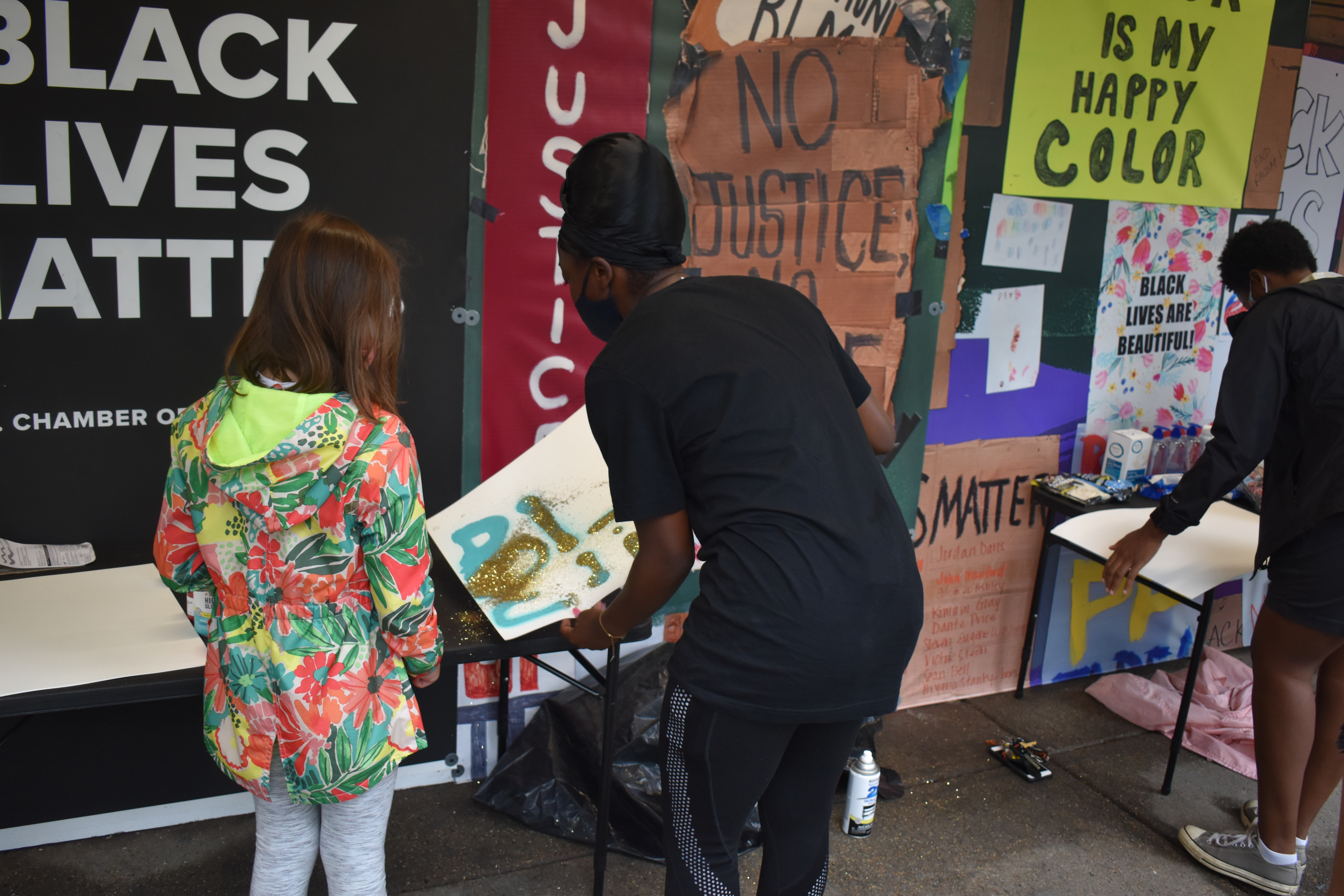She goes back to her work. Pulling out white spray paint, Smithen quickly and neatly writes four letters. She hands the canvas to her mom, Lauren Grimes Smithen. Even while wearing a mask, it’s clear that the 10-year-old is proudly beaming.
