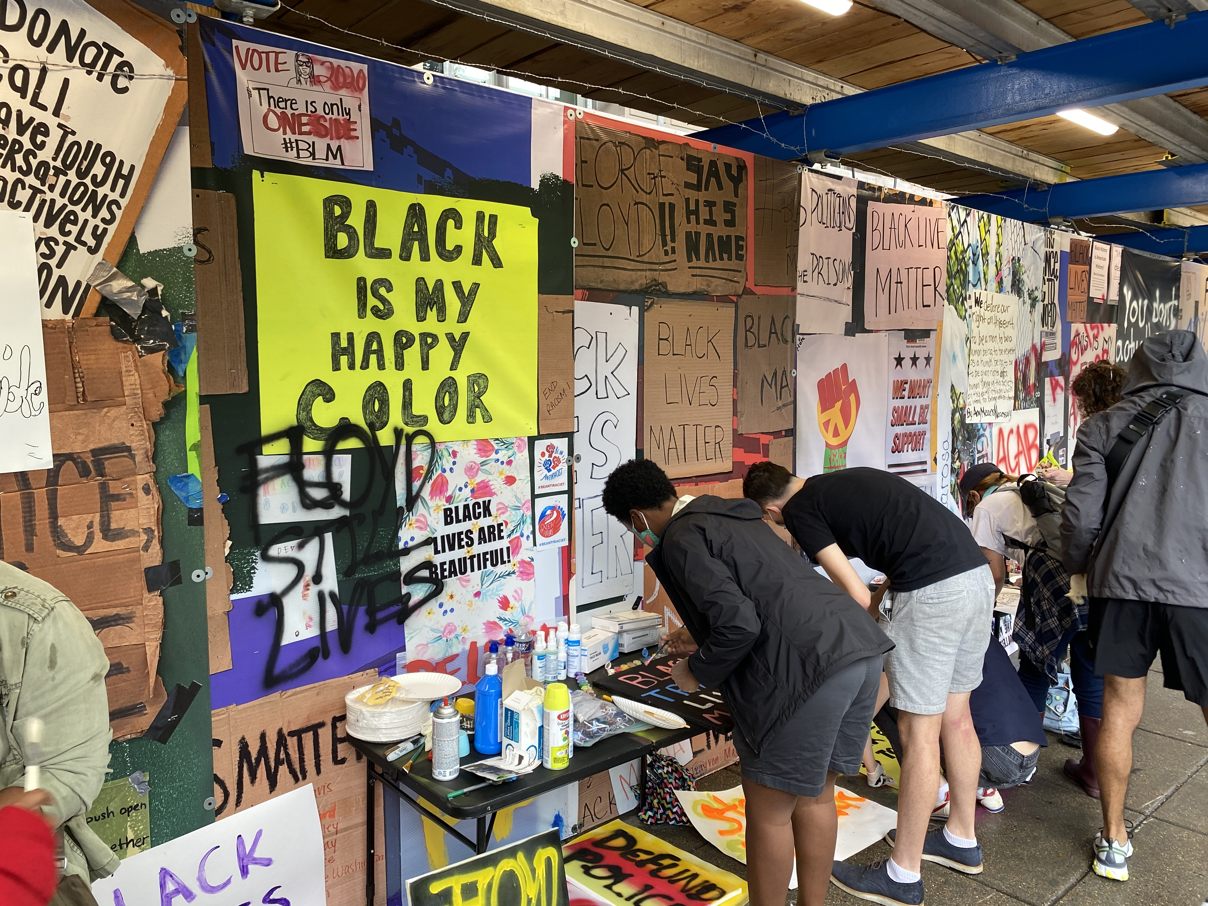 Under some scaffolding on H Street, steps from the giant, yellow block letters, a gallery of protest art sprung up depicting messages and images connected to the cause.