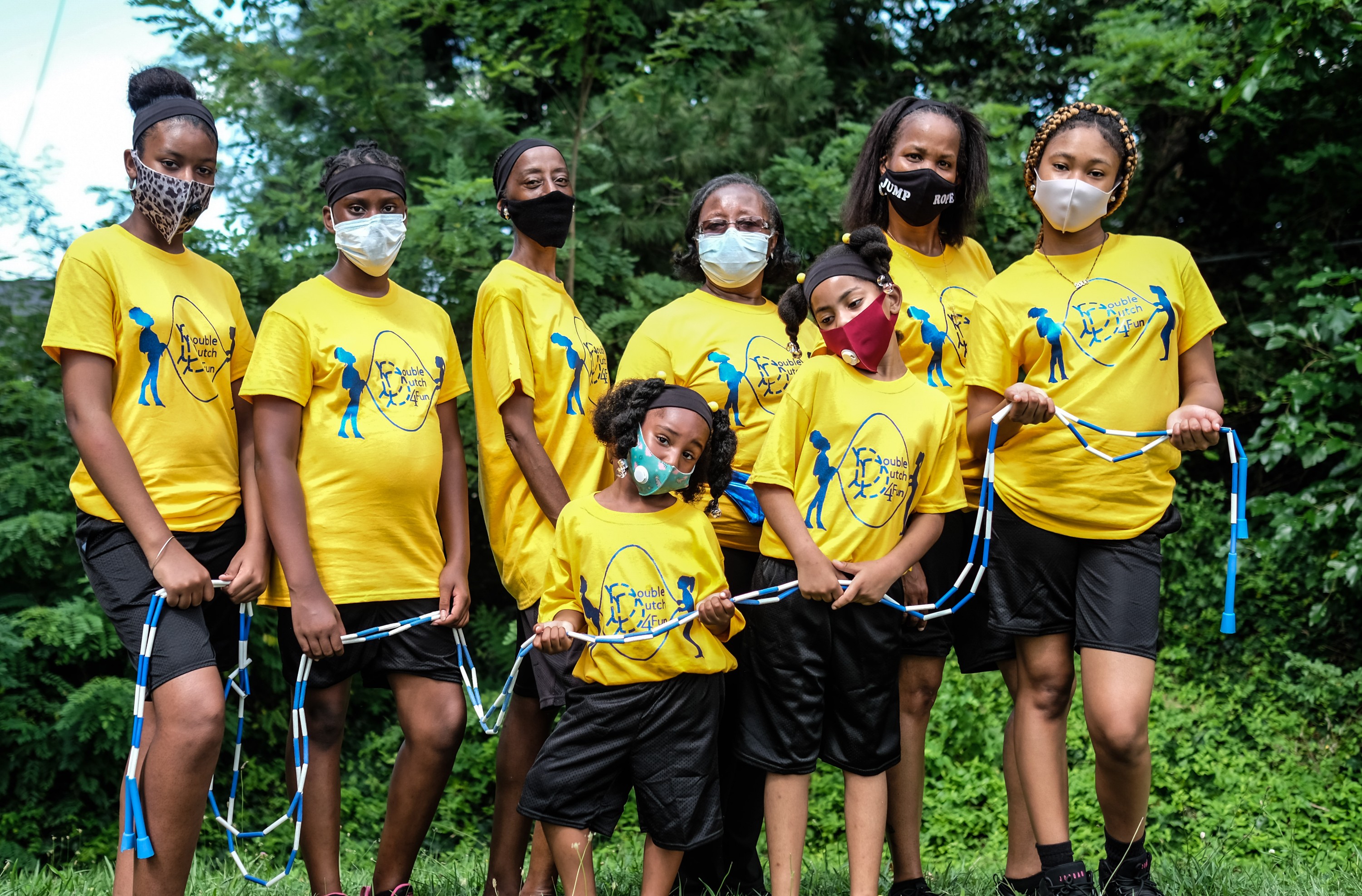 A group of five girls age four through 14 are wearing bright yellow uniforms, as Robin Ebb, lead instructor of Double Dutch For Fun, calls out “When I say double, you say.”