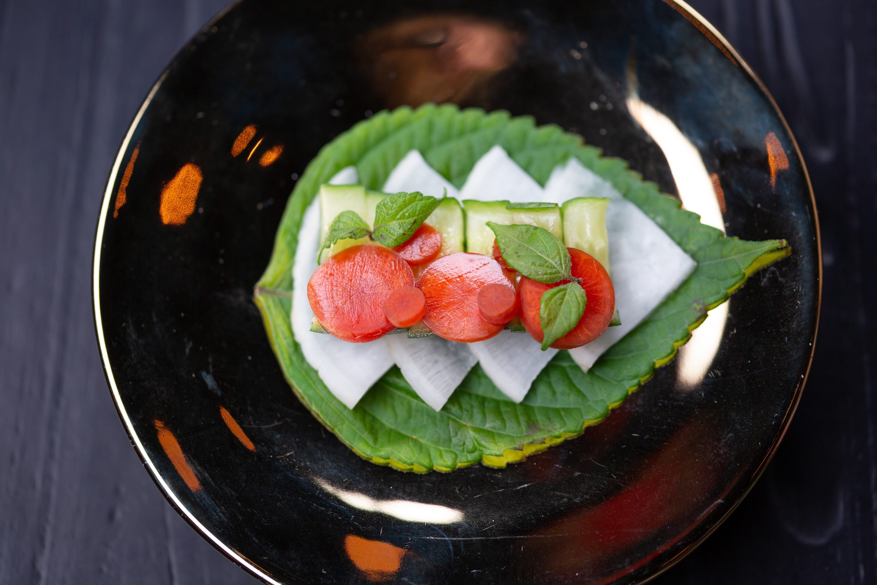 Norris’ cooking prioritizes local ingredients as much as possible, letting nature dictate the direction. Produce like leeks, mushrooms, and eggplant comes from a Japanese farmer in Delaware, and he says it arrives so fresh that the vegetables are often still on the vine when he orders. Fish is sourced from the West Coast and Japan.