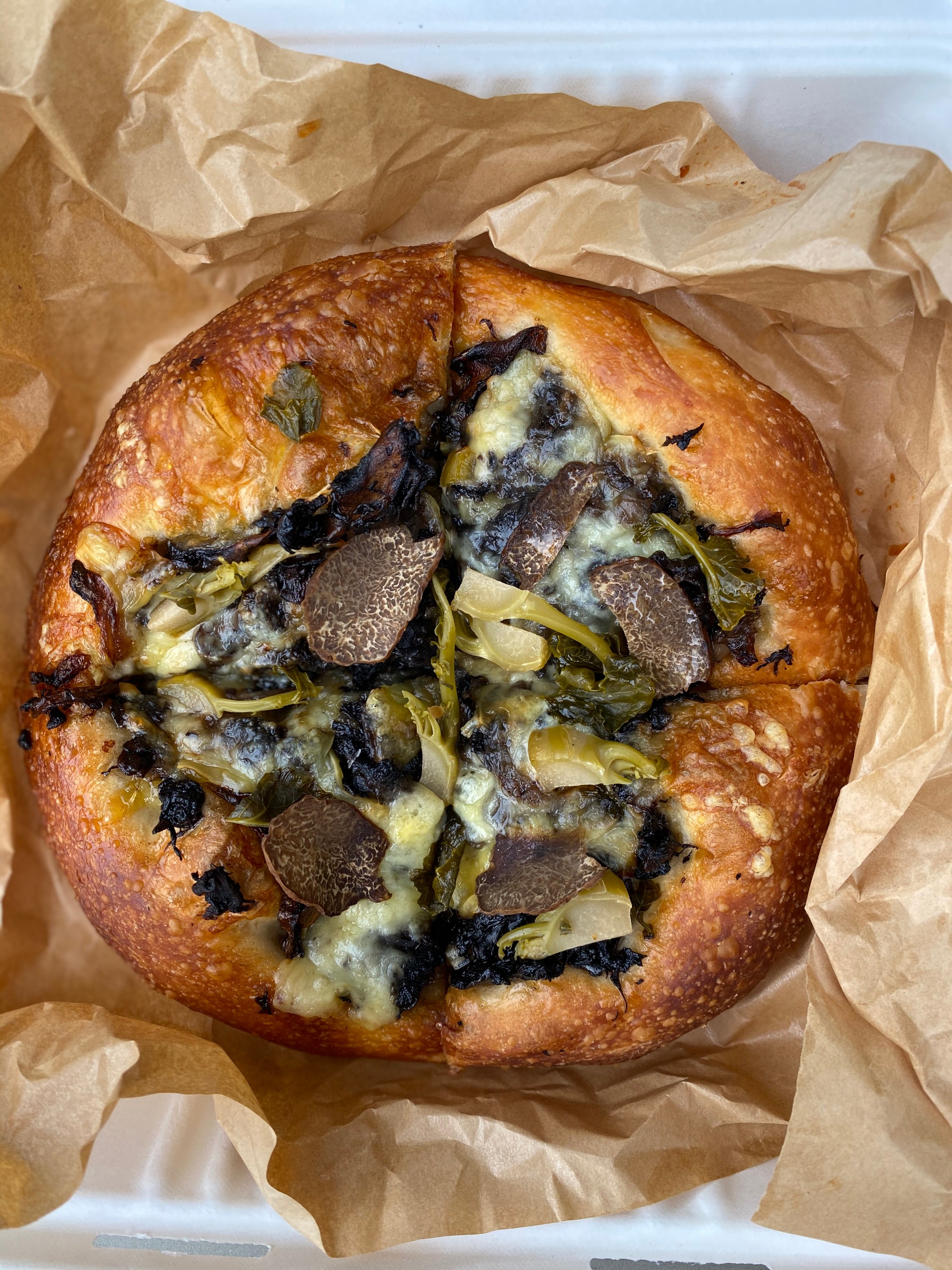 The team was set to open in March, right when the pandemic restrictions began. They say that they’re not comfortable opening the indoor dining area quite yet: Instead they’re curating the takeout experience. The team plans to offer extras like candles in oyster shells and a playlist so that diners can create that refined feeling while eating at home during a pandemic.Virginia-grown truffles are available as an add-on topping to elevate certain dishes ($8). Kuller even hand-decorates many of the to-go bags.