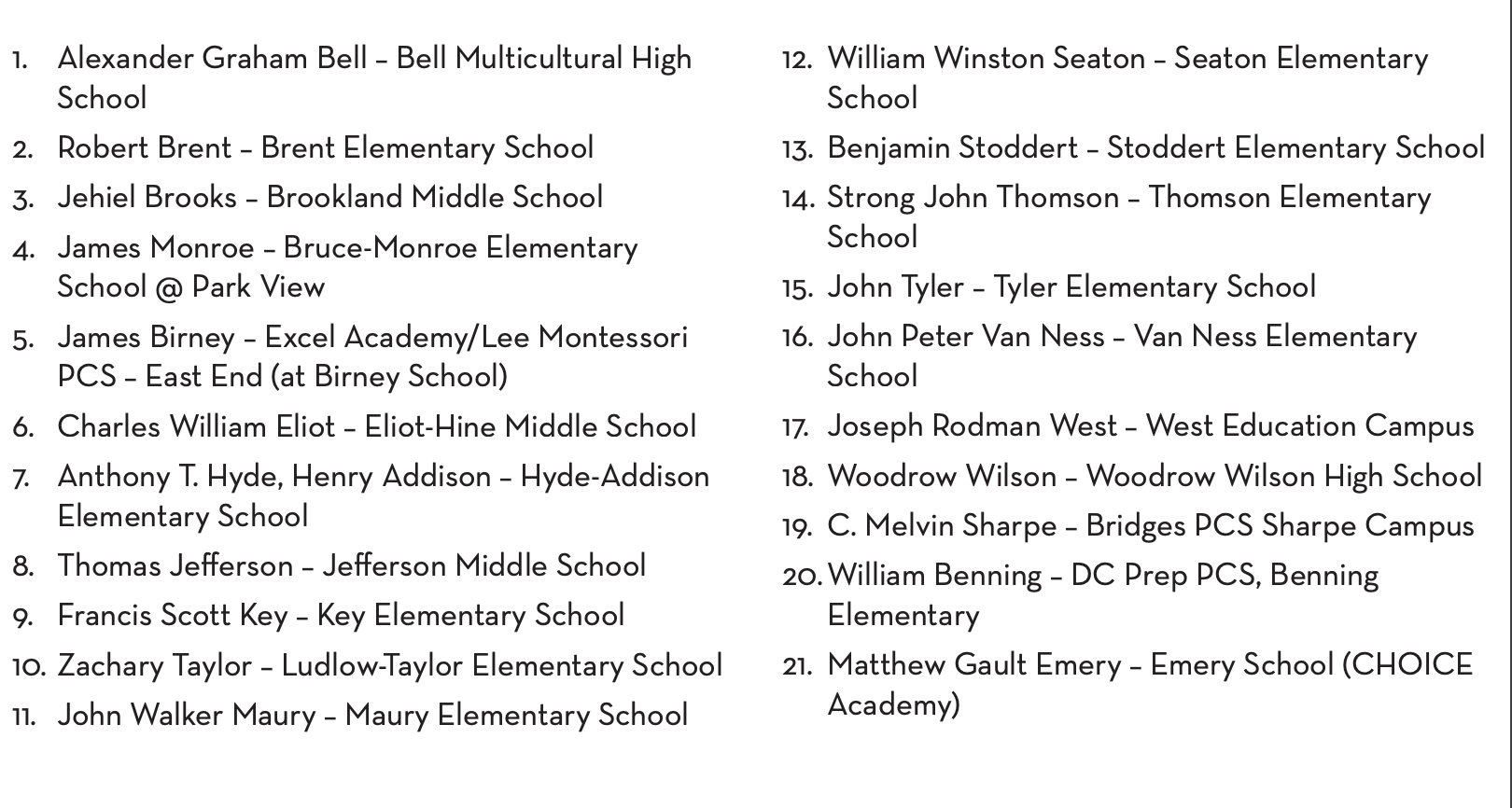 Twenty-one different public and charter schools in D.C. were identified for renaming, including Woodrow Wilson High, a school that’s been at the center of a renaming discussion. Nine residential buildings, 12 parks, and playgrounds, and seven government buildings were also flagged. The working group lists eight different statues and memorials for relocation, removal, or contextualization — including the Albert Pike statue that was recently torn down by protesters, and the Jefferson Memorial.