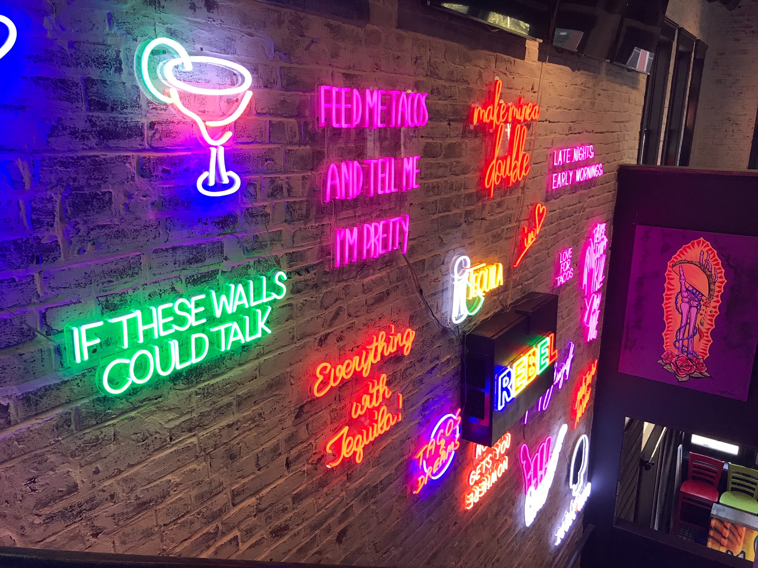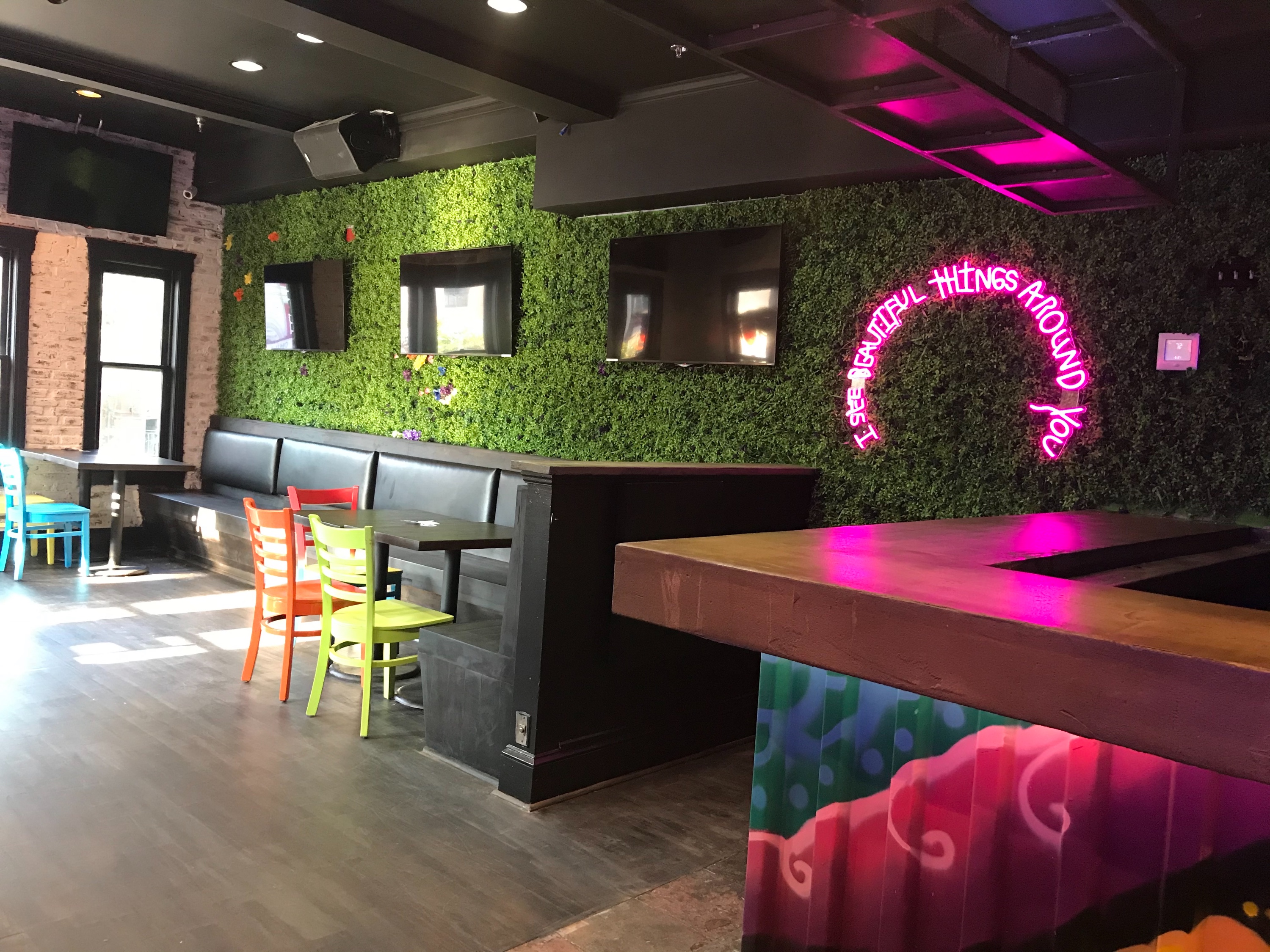 Inside, the exposed brick wall stairwell is vibrant with a large collection of fluorescent decor. At the top of the stairwell, a green wall — literally, a wall of greenery — is accented by a bright pink halo that spells out: “I see beautiful things around you.” (“This is where all the Instagram action happens,” Bramson says.) The second floor will eventually house a tequila library — effectively a large display of tequilas from across the world — and bar that’s slated to open in early fall.