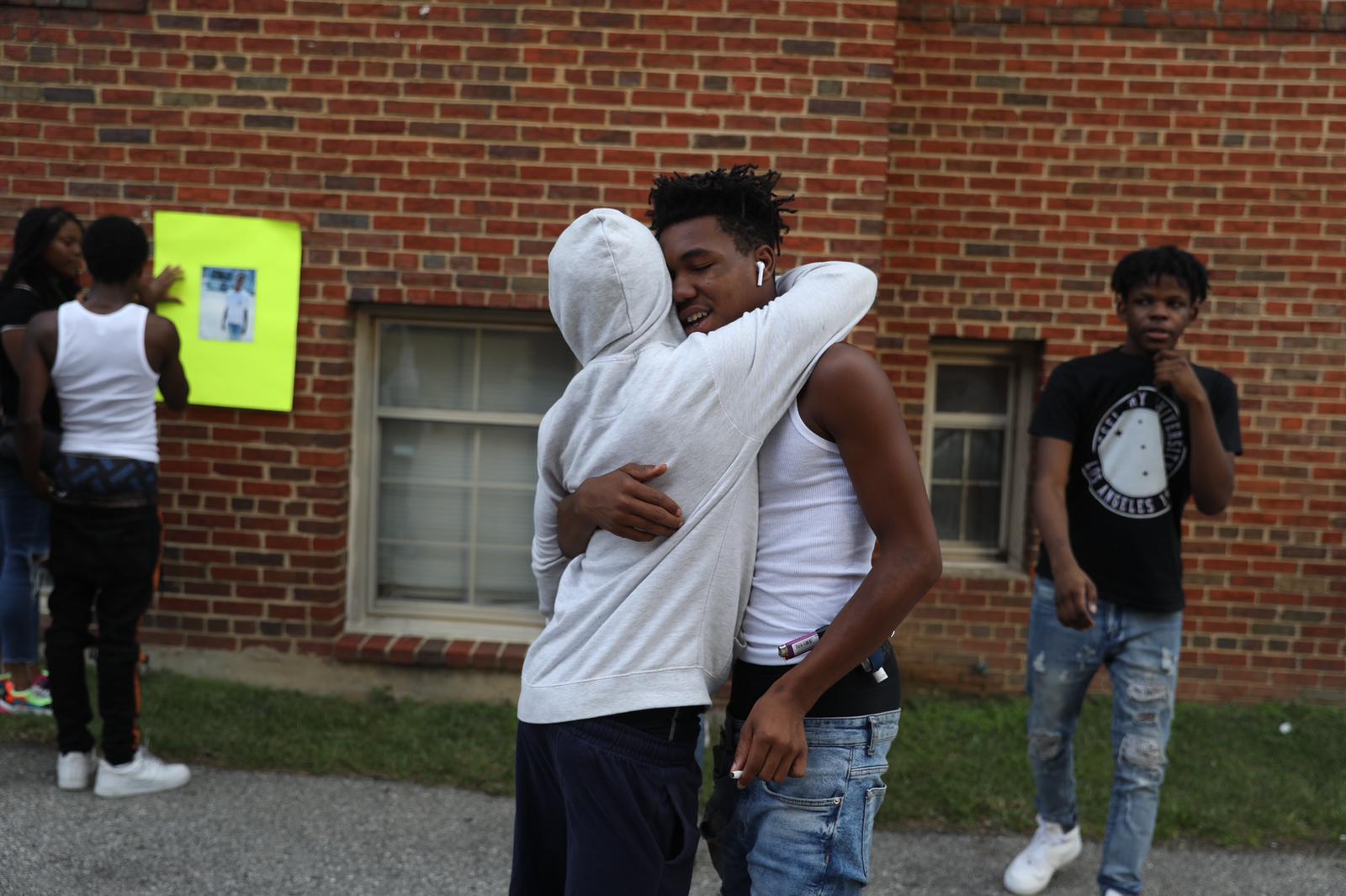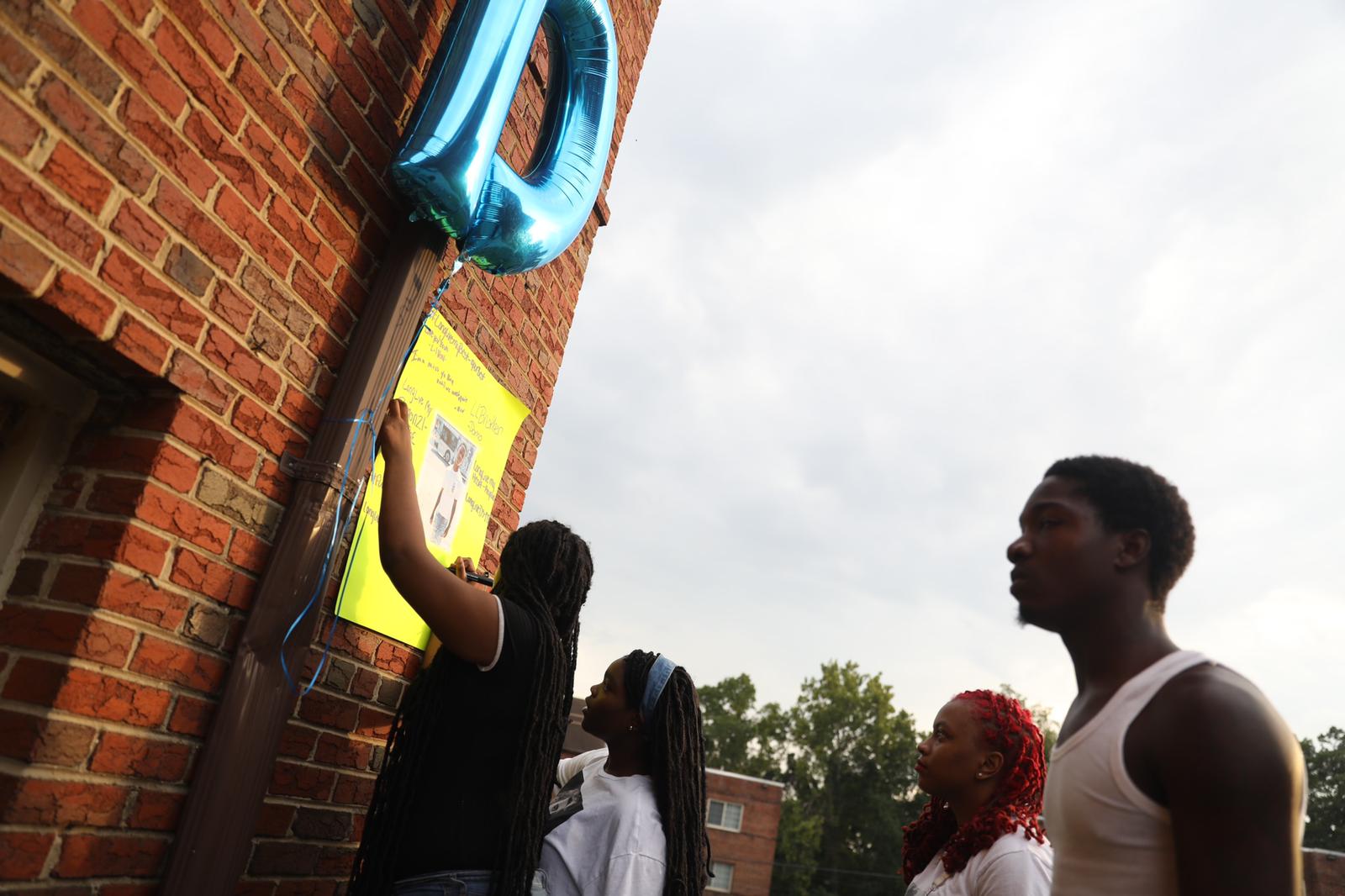 On Friday evening, friends of Kay gathered in front of the the apartment building in Congress Heights where the shooting occurred. They added a poster with his photo on it to a small memorial that had already begun with stuffed animals, candles, and other mementos. The teens took turns writing messages for him like “Ima miss ya boy” and “We love you” as they consoled one another. (They agreed to be photographed and declined to be interviewed.)