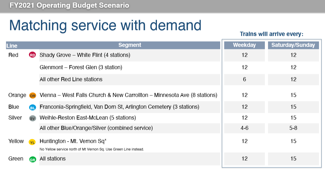 The Red Line Grosvenor and Silver Spring turnbacks and Yellow Line turnback at Mt. Vernon Square would also likely be reinstituted. The turnbacks reverse some trains that are not as full toward the end of the lines.