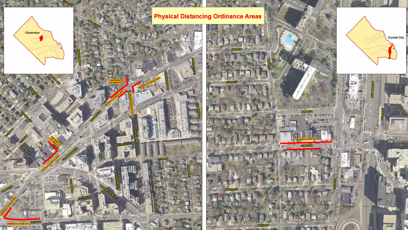 The ordinance was implemented along popular sidewalks in Clarendon and Crystal City, where crowds have lined up outside eating and drinking establishments in recent months. The sites were selected based on data from the Arlington Restaurant Initiative and online complaints about social distancing violations.