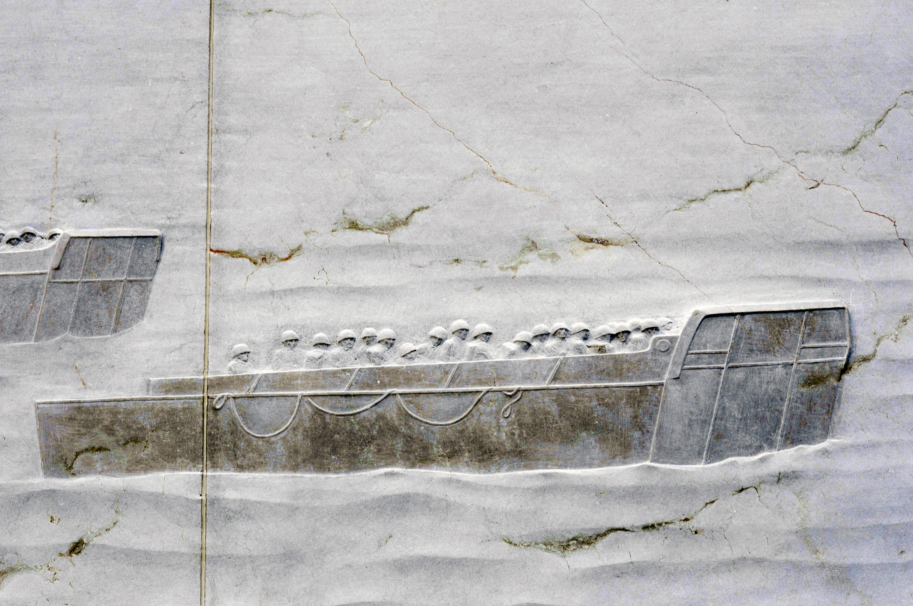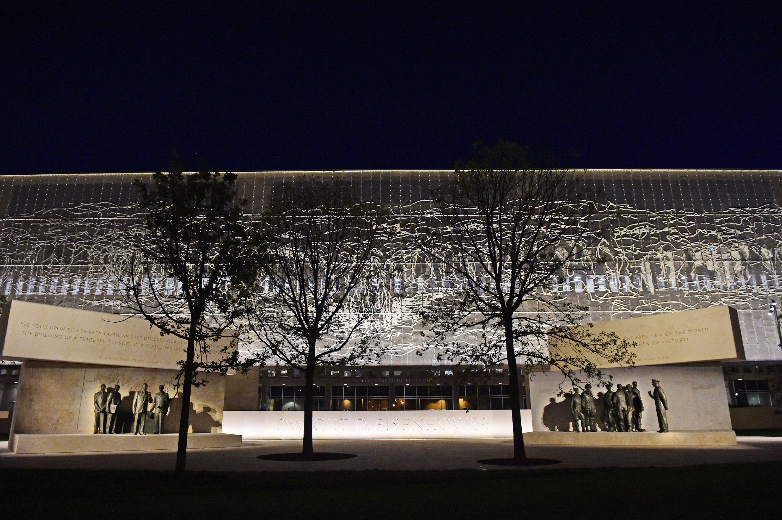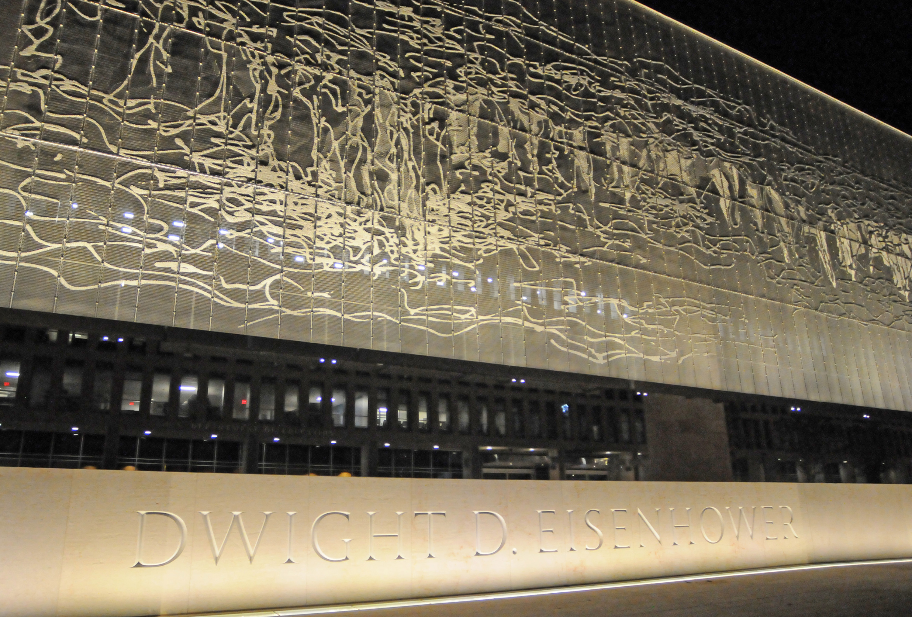 Above and spanning nearly the length of the Department of Education building that sits behind the memorial is a giant stainless steel tapestry nearly 450 feet wide and 60 feet tall made up of 600 panels that depicts, in squiggly lines, the Pointe de Hoc cliff on the Normandy coast that American soldiers famously climbed up during the D-Day invasion.