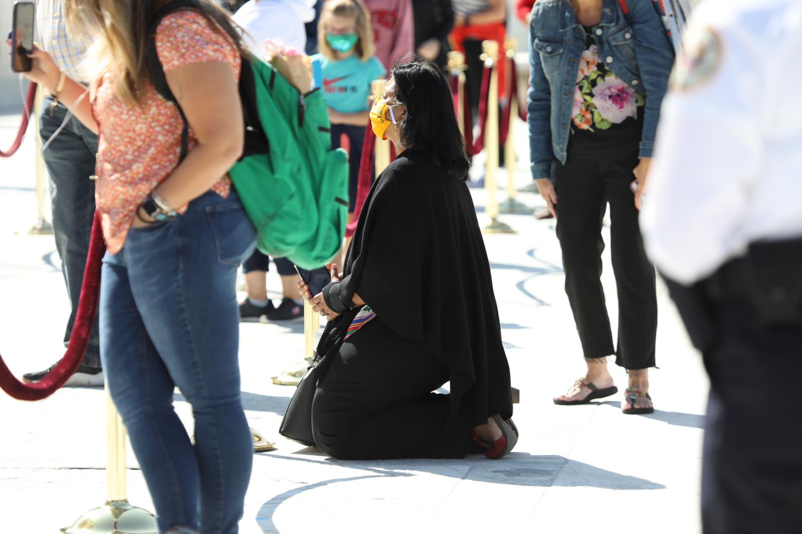 Crowds, meanwhile, continued to grow outside, weaving through the maze of gates leading up to the building as members of the public prepared for the viewing. D.C. native Rick Roy, a longtime employee tasked with cleaning the Supreme Court building (he says the justice was always tidy) sold “Notorious RBG” shirts to those gathering for a place in line. Melissa Byrne, a representative with a court justice advocacy organization, handed out free face masks to the crowd, printed with the words “honor her wish.”