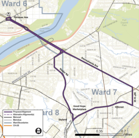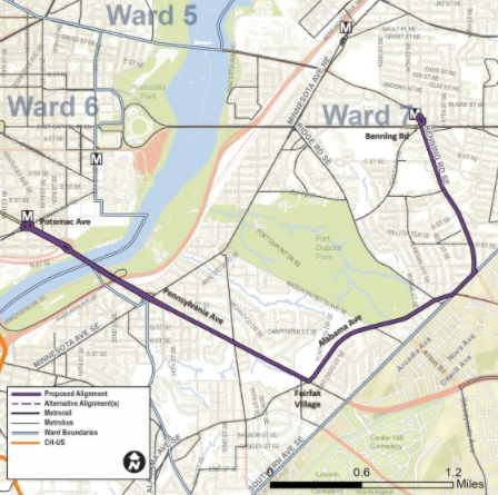 - Potomac Avenue-Benning Road (Southeast Alignment Alternative 1): Metrobus routes M6 and W4 would share connections on this 9.30 mile route.