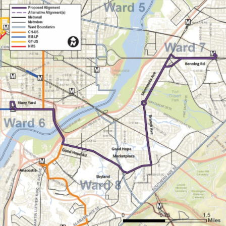- Navy Yard-Benning Road via Minnesota Avenue (North-South Alignment Alternative 3): Metrobus route W4 would share connections; this 10.95 mile route would serve Benning Road and Navy Yard Metro Stations, and Skyland.