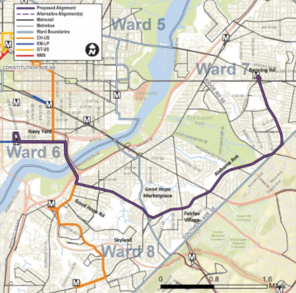 - Alabama-Good Hope-Naylor Road (Southeast Alignment Alternative 2): This 10.92 mile route is currently served by Metrobus routes M6 and the 30s.