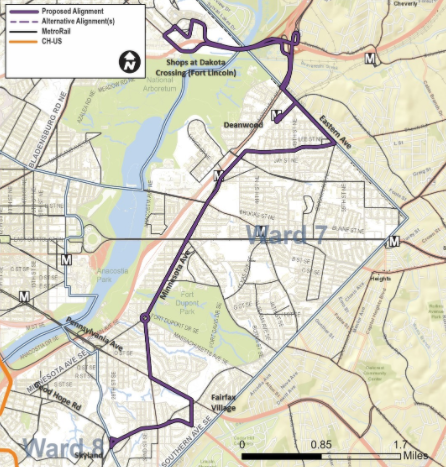 - Skyland-Minnesota Avenue-Deanwood (North-South Alignment Alternative 1): Currently served by Metrobus U7, this 12.59 mile route would serve Deanwood and Minnesota Avenue Metro Stations, and Skyland; an alternative end of line at Fort Lincoln would extend the route to 18.06 miles.