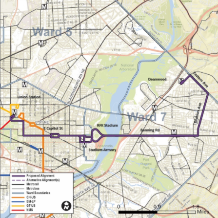 - Union Station-Deanwood-East Capitol Street (Northeast Alignment Alternative 1): Currently served by Metrobus Route 97 peak service, this 14.56 mile route would serve Deanwood, Benning Road, Stadium Armory, and Union Station Metro Stations.