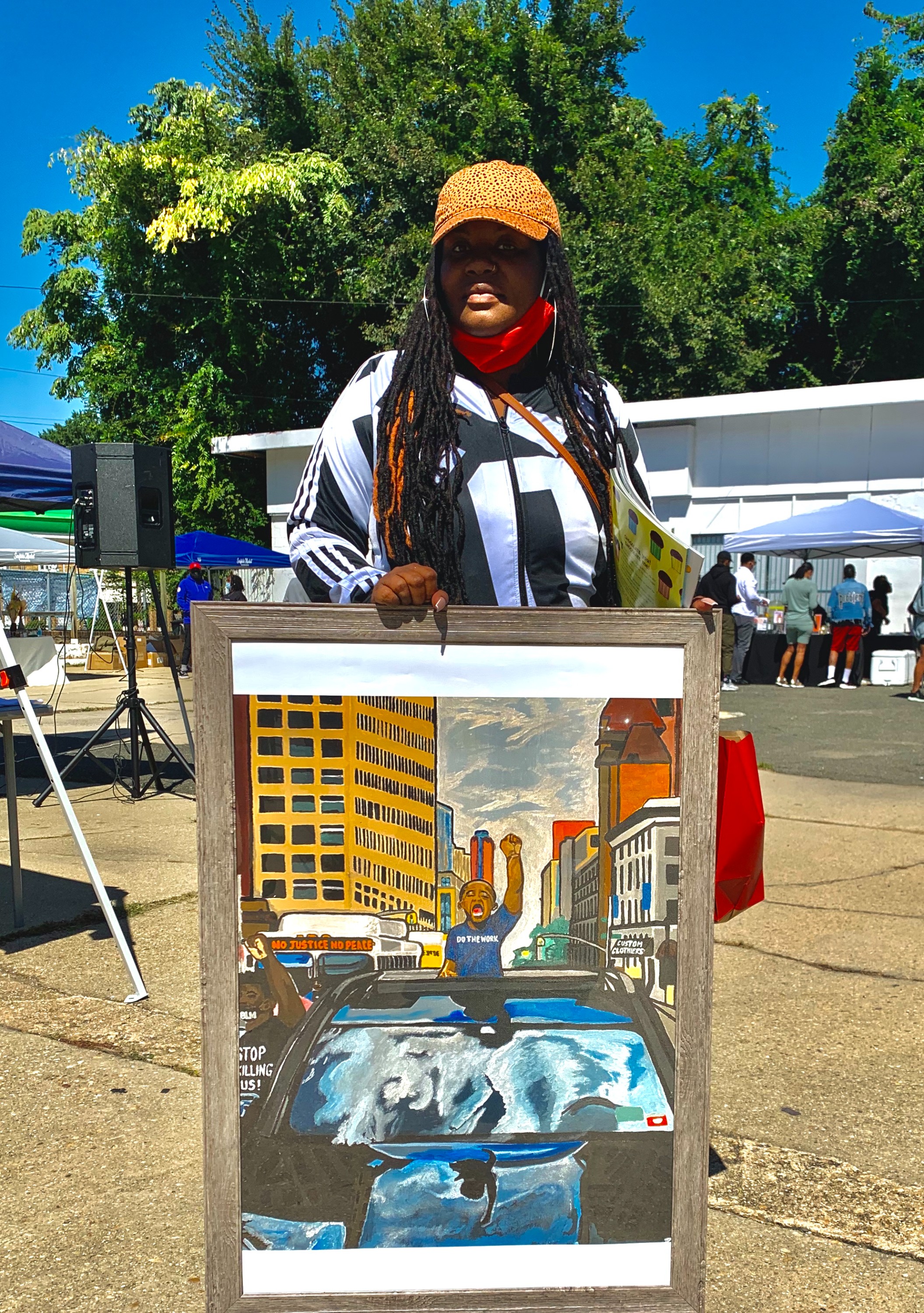 The painting is of a small Black child protesting with his fist raised, mouth wide open, and wearing a shirt that says “Do the work.” Alongside him is an older Black man with a shirt that says, “Stop killing us.” Barratt says when she sees it, she sees her 4-year-old son. The painting will go up in his room.