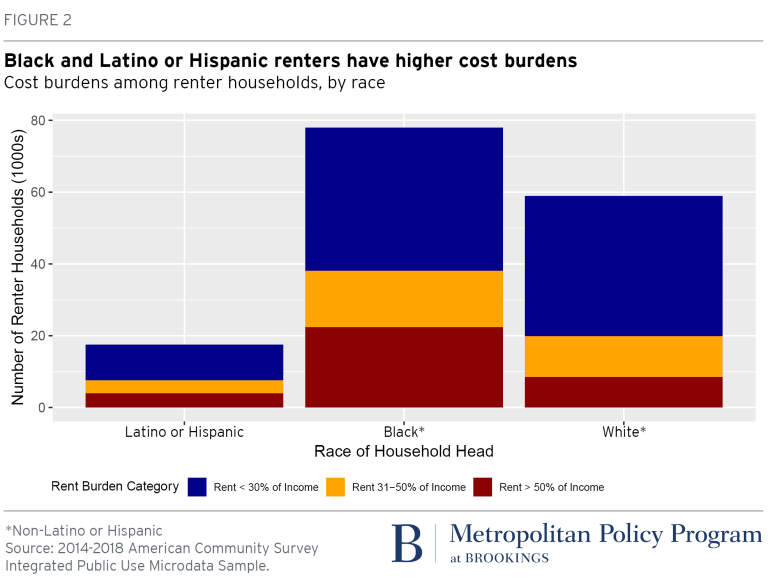 This burden isn’t evenly shared. In D.C., about half of Black and Latino renters were cost-burdened in 2018, compared to a third of white renters, according to an analysis from Harvard’s Joint Center for Housing Studies. Median rent in the area grew 16% from 2008 to 2018, while renter income grew only 9%. The stock of housing with rent under $900 a monthdropped precipitously, while housing that costs more than $1,400 per month nearly doubled.