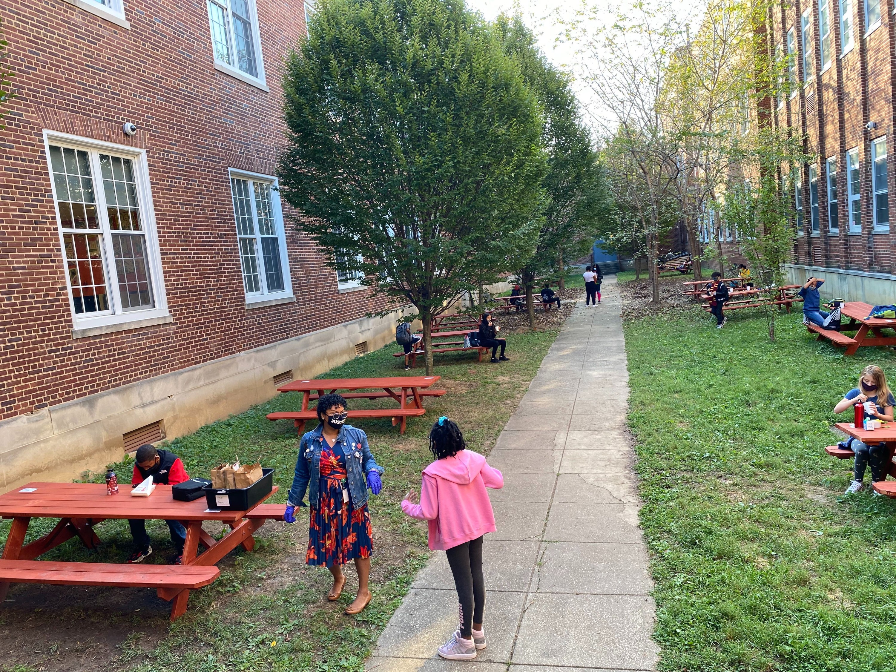 At Truth, students are encouraged to study and explore outside as much as possible, said Principal Denise Edwards. Breakfast and lunch are held outdoors, where students’ assigned seats are spread across several large, red picnic tables. WiFi was routed to the school’s courtyard so teachers could hold class lessons outside.