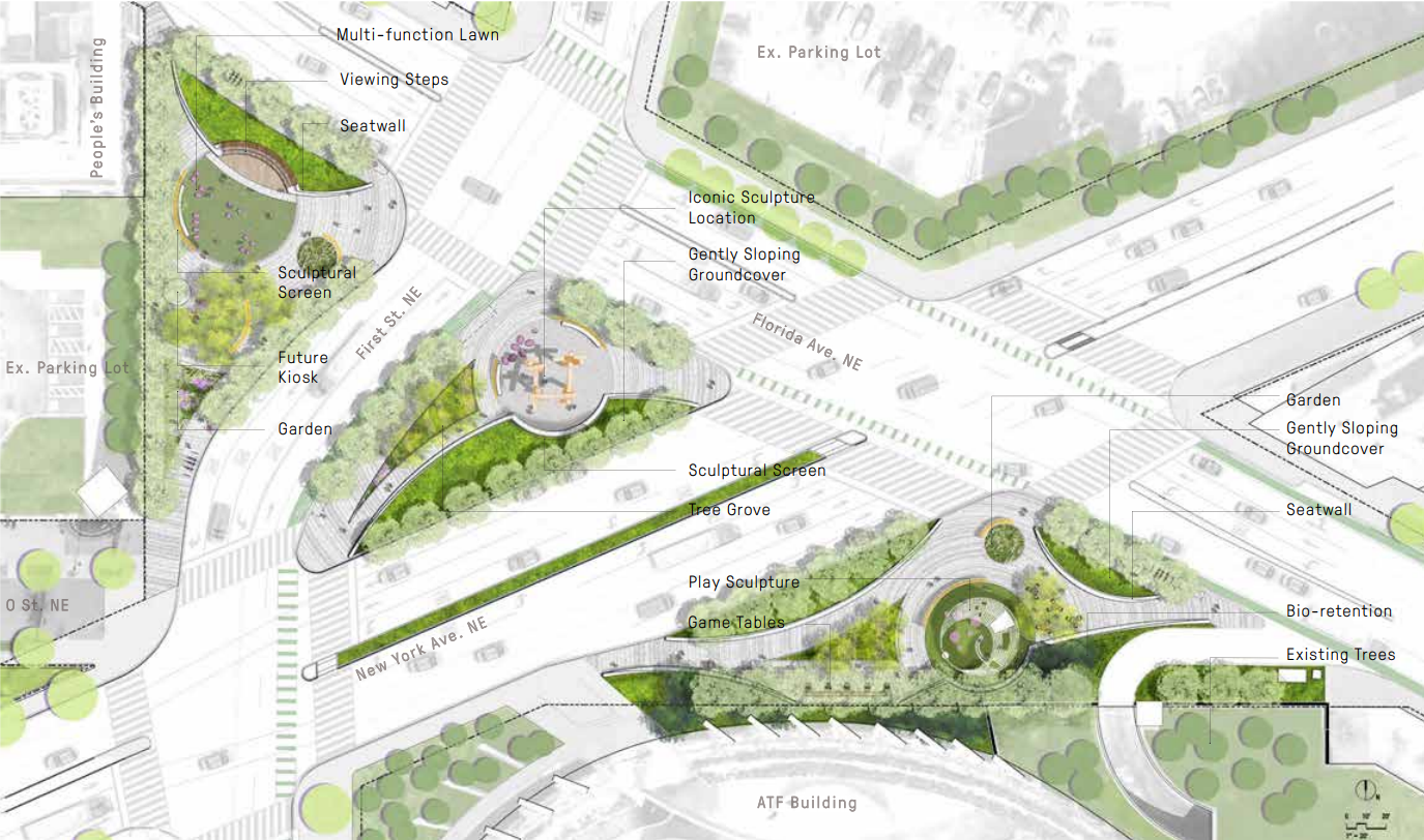 The plan was submitted jointly by the NoMa Business Improvement District and the District Department of Transportation. It aims to create three mini-park areas that total 1.3 acres. It would bring more green space to a neighborhood that has little, foster a sense of community, and use art as a place-maker. Originally, DDOT had submitted a plan with just grass and trees, but NoMa officials said they’d pay for additional outdoor public space design because of the importance of the area.