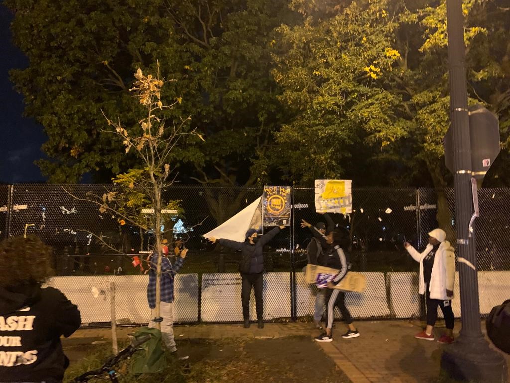 Smith and Zhang said they left the plaza around 11 p.m. after most of the signs had come down. The two took a few large canvas prints depicting local protests with them. They hope to come back and hang them back up on the fence this week — and it’s likely that they won’t be alone in trying to replace the protest art on the fence.