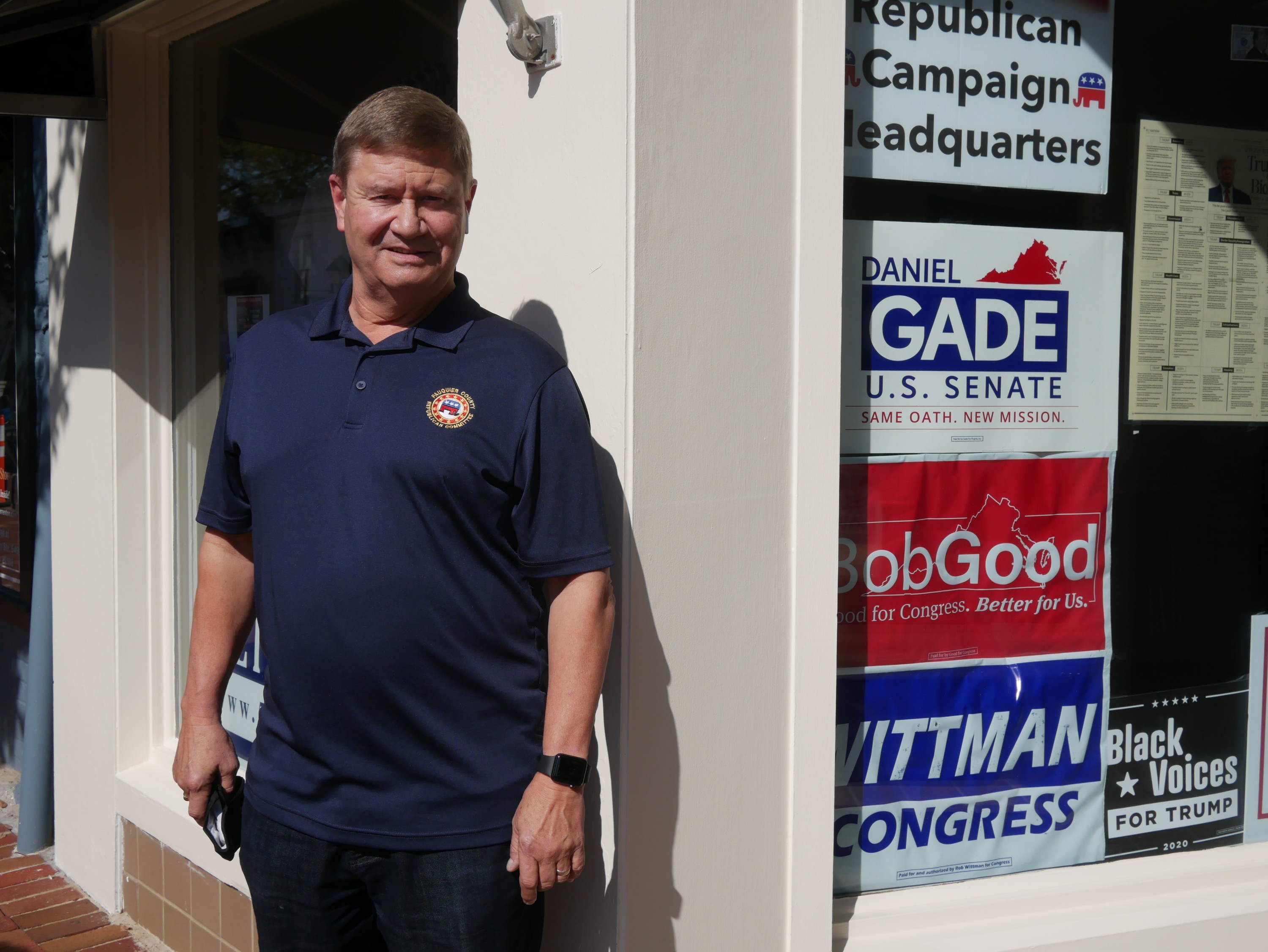 At the headquarters of the Fauquier County Republican Committee in Warrenton, Virginia, a cardboard cutout of John Wayne gripping a rifle leans against a wall. Chair Gregory Schumacher says Wayne was “the great American Western hero,” and he says Republicans who held the Fifth District in Congress for all but two of the last 20 years will keep it in their hands this November.