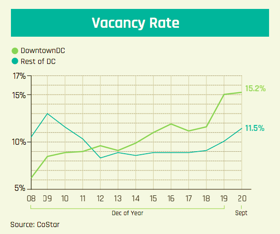 Office vacancy rates hit record levels in downtown D.C. (15.2%) and the city as a whole (11.5%), continuing a three-year trend. There were no office sales in the entire city in the past three months of the year, a fact the report’s authors call “highly unusual.”