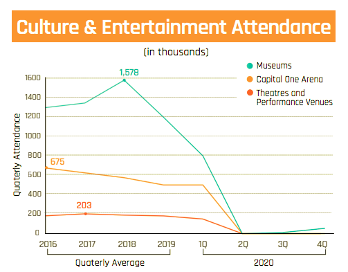 However, many culture and entertainment spaces within the DowntownDC BID’s boundaries remain closed, including Capital One Arena, the Walter E. Washington Convention Center, the Shakespeare Theatre and Madame Tussaud’s Wax Museum (that perennial favorite of out-of-town tourists). Over 1,000 theater shows and other performances were cancelled between March and December 2020. The ensuing loss of patrons — around 400,000 of them, according to the report — hurts restaurants, bars, parking garages, Metro, ride sharing services and other businesses.