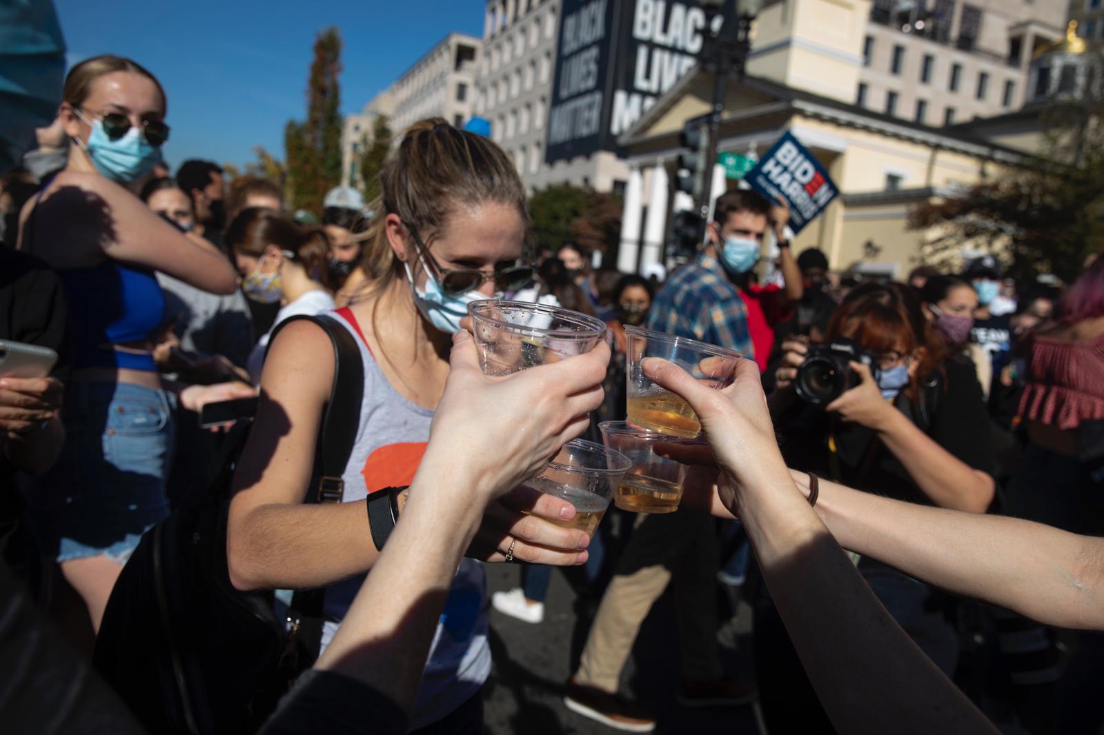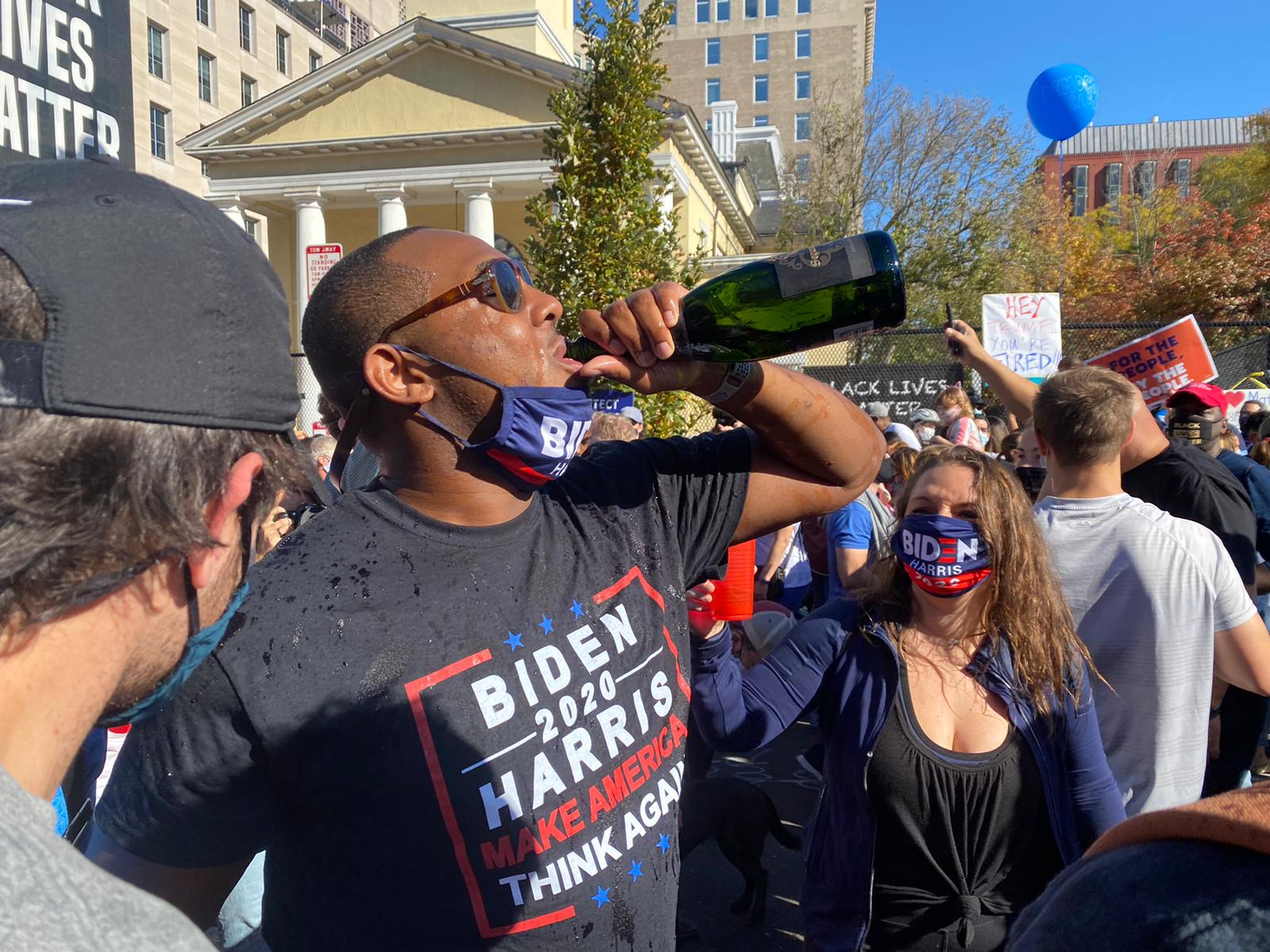 News of Joe Biden and Kamala Harris’ election to the White House, called by the AP and other networks around 11:30 a.m. Saturday, washed over the deep blue D.C. region and kicked off a full day of celebration. By day’s end, trash cans downtown brimmed with cups and empty Champagne bottles.