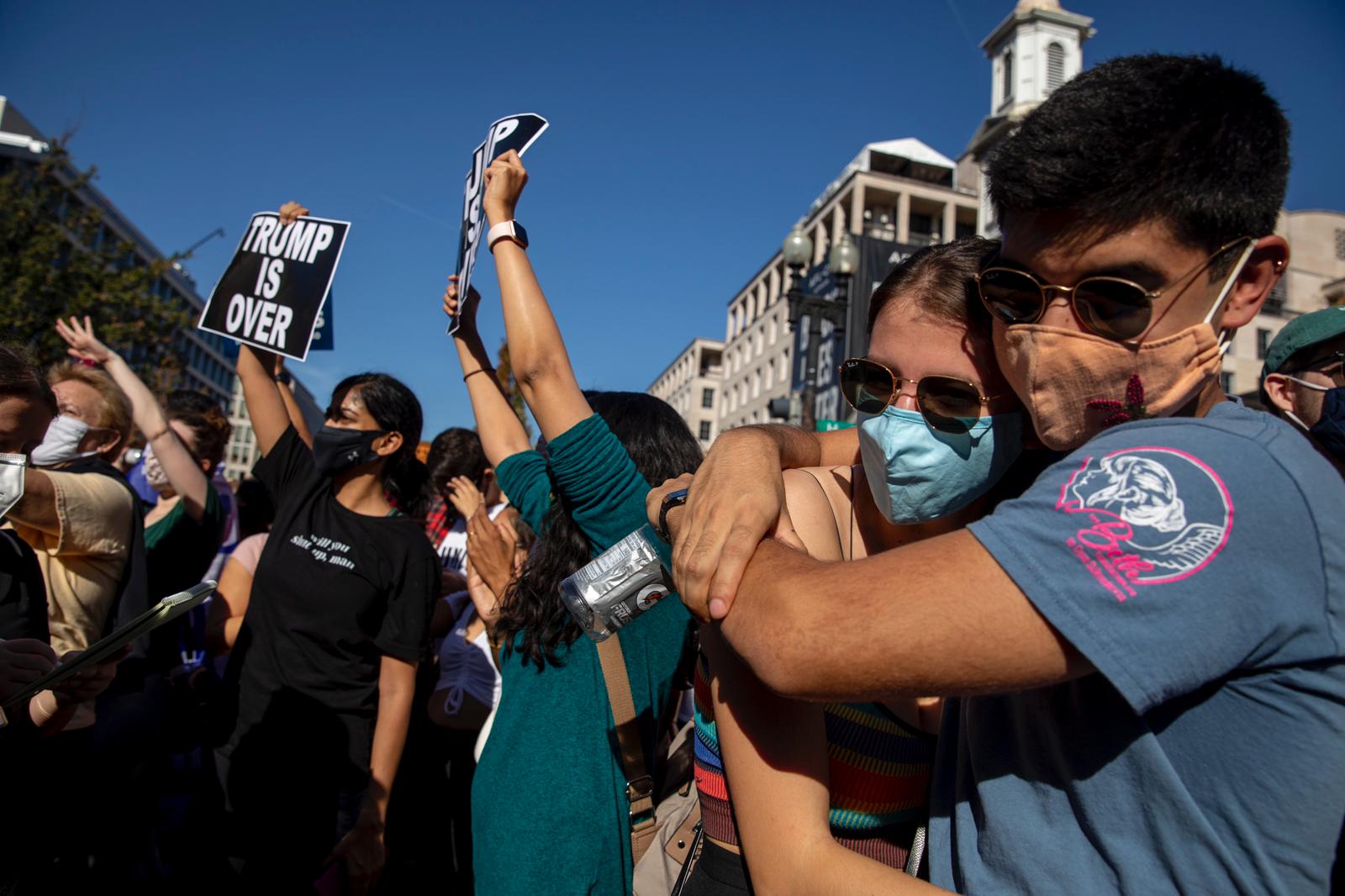 Large crowds gathered in D.C. Saturday to celebrate Democrats Joe Biden and Kamala Harris ascending to the White House.Tyrone Turner / DCist/WAMUWaving a Biden/Harris flag amid large crowds in downtown D.C.Tyrone Turner / DCist/WAMUAttendees hugging during a mass celebration on Saturday.Tyrone Turner / DCist/WAMU“I feel like every day I‘ve been holding my breath in the worst nightmare of my life. I am so happy that day is over,” said Malcolm Sherod, a 26-year-old lobbyist, after taking a celebratory swill of bubbly straight from the bottle in Black Lives Matter Plaza on Saturday.Daniella Cheslow / WAMU/DCistWashingtonians celebrate in Thomas Circle Park on November 7, 2020 after Joe Biden is declared the president-elect.Dee Dwyer / DCist/WAMUSupporters of President Donald Trump knelt and prayed near the Washington Monument on Saturday after the news of Joe Biden’s projected victory in the 2020 election.Mikaela Lefrak / WAMU/DCistThousands poured into Black Lives Matter Plaza to celebrate Biden’s presidential win.Tyrone Turner / DCist/WAMUTokë Vandervoort and her daughter, Katie Sciandra Vandervoort, embrace during celebrations in downtown D.C. on November 7, 2020.Tyrone Turner / DCist/WAMUKareem Primo of D.C. celebrates in downtown D.C. on November 7, 2020.Tyrone Turner / DCist/WAMUCardboard cutouts of Kamala Harris and Joe Biden made an appearance downtown on November 7, 2020.Dee Dwyer / DCist/WAMURaising a toast to Joe Biden’s win in Black Lives Matter Plaza. The manager of Imperial Wine and Spirits near Farragut Square said he sold more than 100 bottles of Champagne and sparkling wine in a few hours.Tyrone Turner / DCist/WAMUNina Polaris, of Bowie, Maryland, raises a fist in downtown D.C. amid the celebration on November 7, 2020.Tyrone Turner / DCist/WAMUWaving a rainbow flag as the sun sets downtown.Tyrone Turner / DCist/WAMUSusan Benesch and her 16-month-old daughter stand in Black Lives Matter Plaza after Joe Biden was declared the president-elect on November 7, 2020.Tyrone Turner / DCist/WAMUSigns saying “You’re Fired” and “Trump/Pence Out Now” are held up during a mass gathering on Saturday.Tyrone Turner / DCist/WAMU