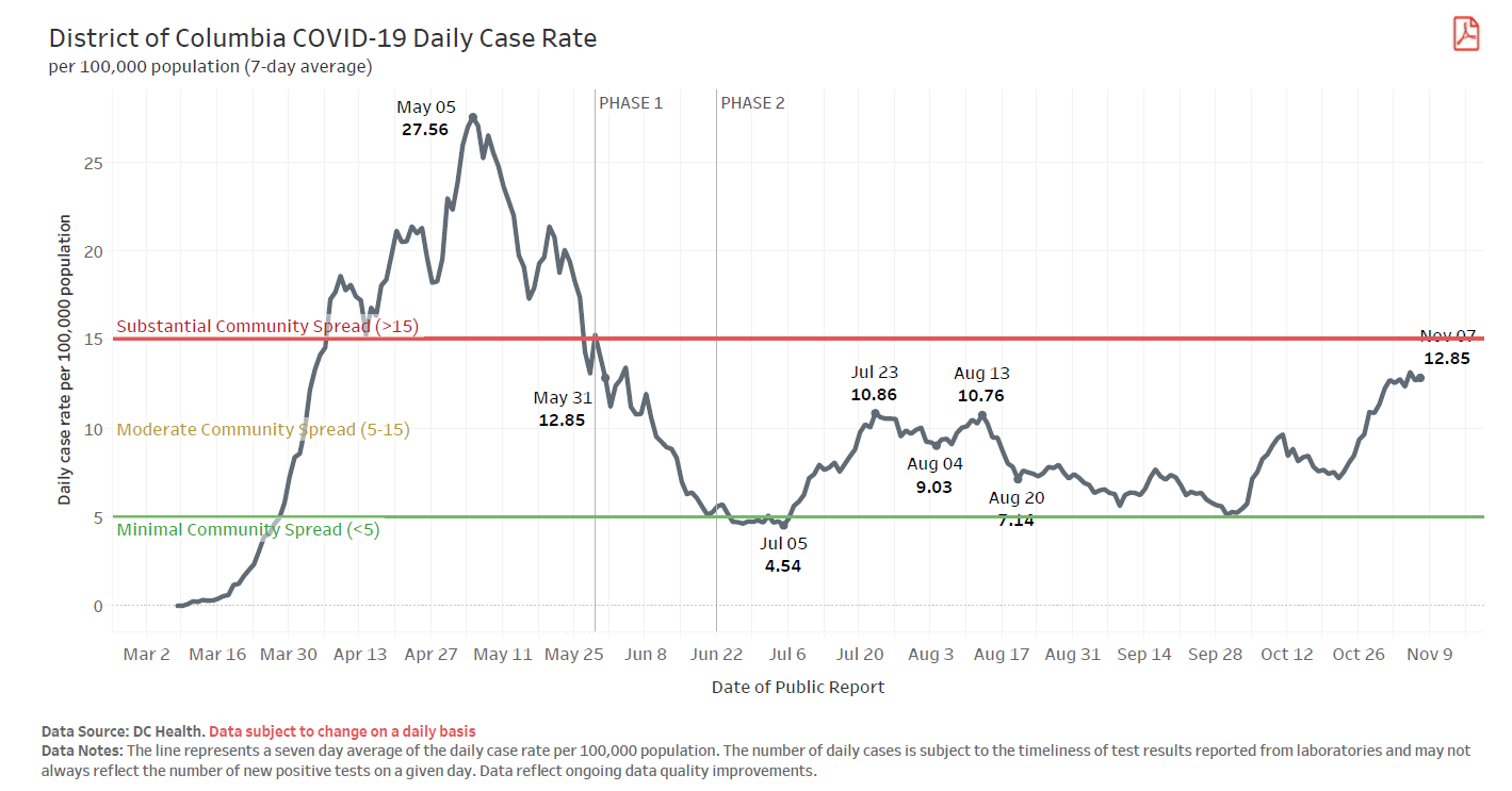 Cases are also ticking back up in D.C., though they’re still below what they were in the spring. The case rate — again, the 7-day rolling average of new cases per 100,000 people— was 12.85 on Saturday, down from a high on May 5 of 27.56. Even so, the District’s case numbers have been creeping up steadily since Oct. 22.