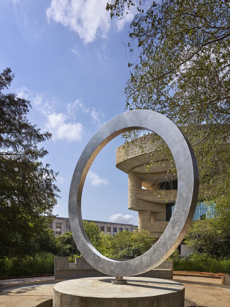 The design centers around a stainless-steel circle that’s 12 feet in diameter and rests on a carved stone drum. Water flows from the center and a fire can be lit during special ceremonies. The seals of the five branches of the armed forces are embedded in a nearby wall. Visitors can leave prayer ties — spiritual symbols that often contain tobacco tied in a bundle — on four vertical lances surrounding the circle. A canopy of trees opens to the memorial’s circular seating area, a quiet pocket on the east side of the museum that has freshwater wetlands.