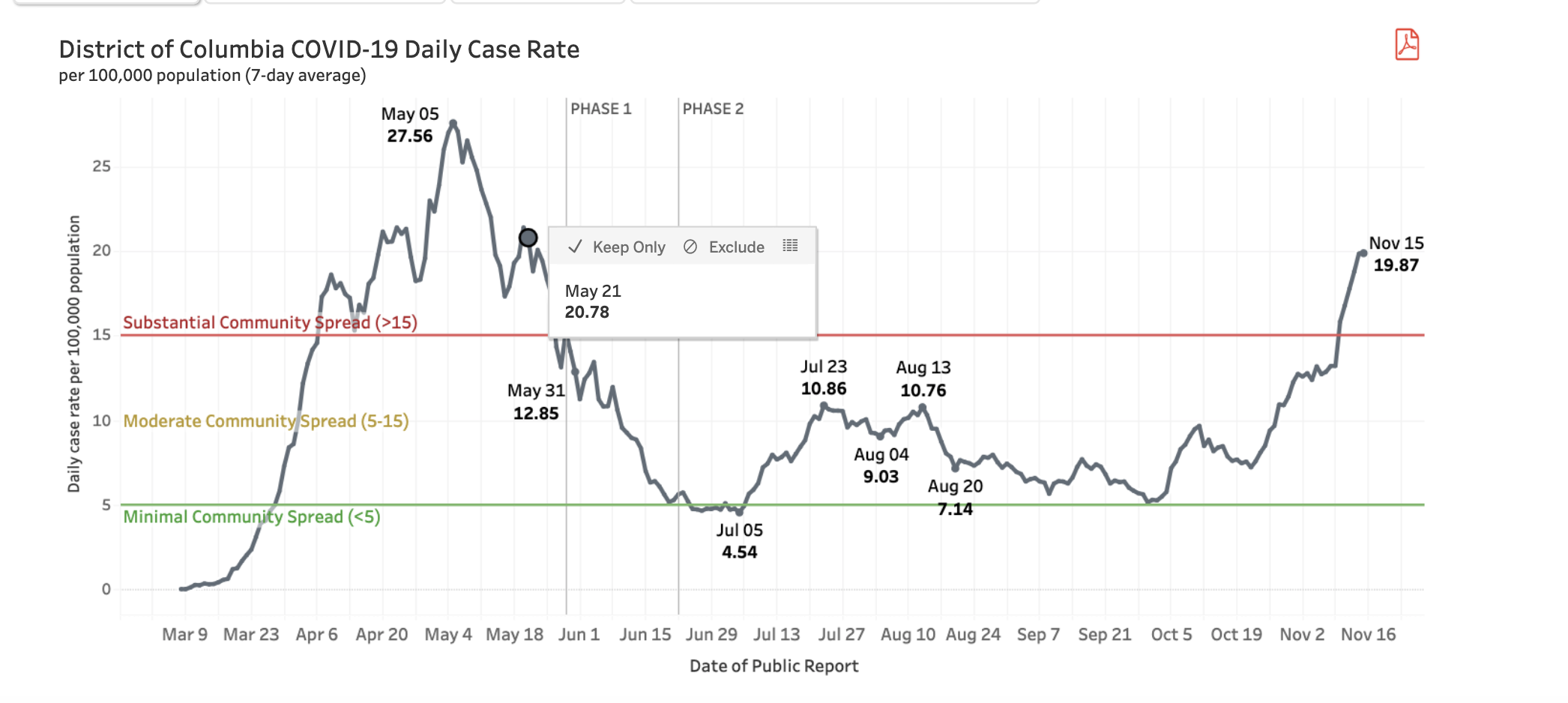 D.C.’s average daily case rate per 100,000 residents is now 19.9 — another high that the District hasn’t seen since May, when the stay-at-home order was still in effect and officials had not yet moved into Phase One of reopening. During the spring surge, the daily case rate per 100,000 residents — a measure of community spread — peaked at 27.56 on May 5, and dropped as low as 4.54 in early July. Per the city’s health department dashboard, D.C.’s community spread has been “substantial,” since Nov. 10.