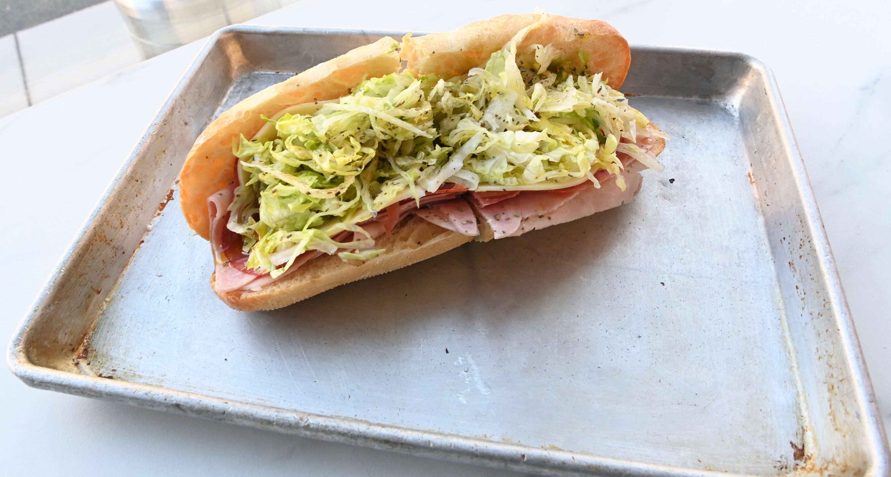 There are only eight subs on the menu, all made with “really nostalgic, recognizable ingredients” and sub rolls from Lyon Bakery. Case in point is the Teamster, Sitcov’s rendition of a classic Italian sub made the usual suspects that fulfill his special equation. There’s ham, capicola, and Genoa salami for the salty-fatty element; provolone for the creamy component; hot and sweet peppers, paper-thin onions, and shredded lettuce for the crunch factor; and oil and vinegar for the sauce.