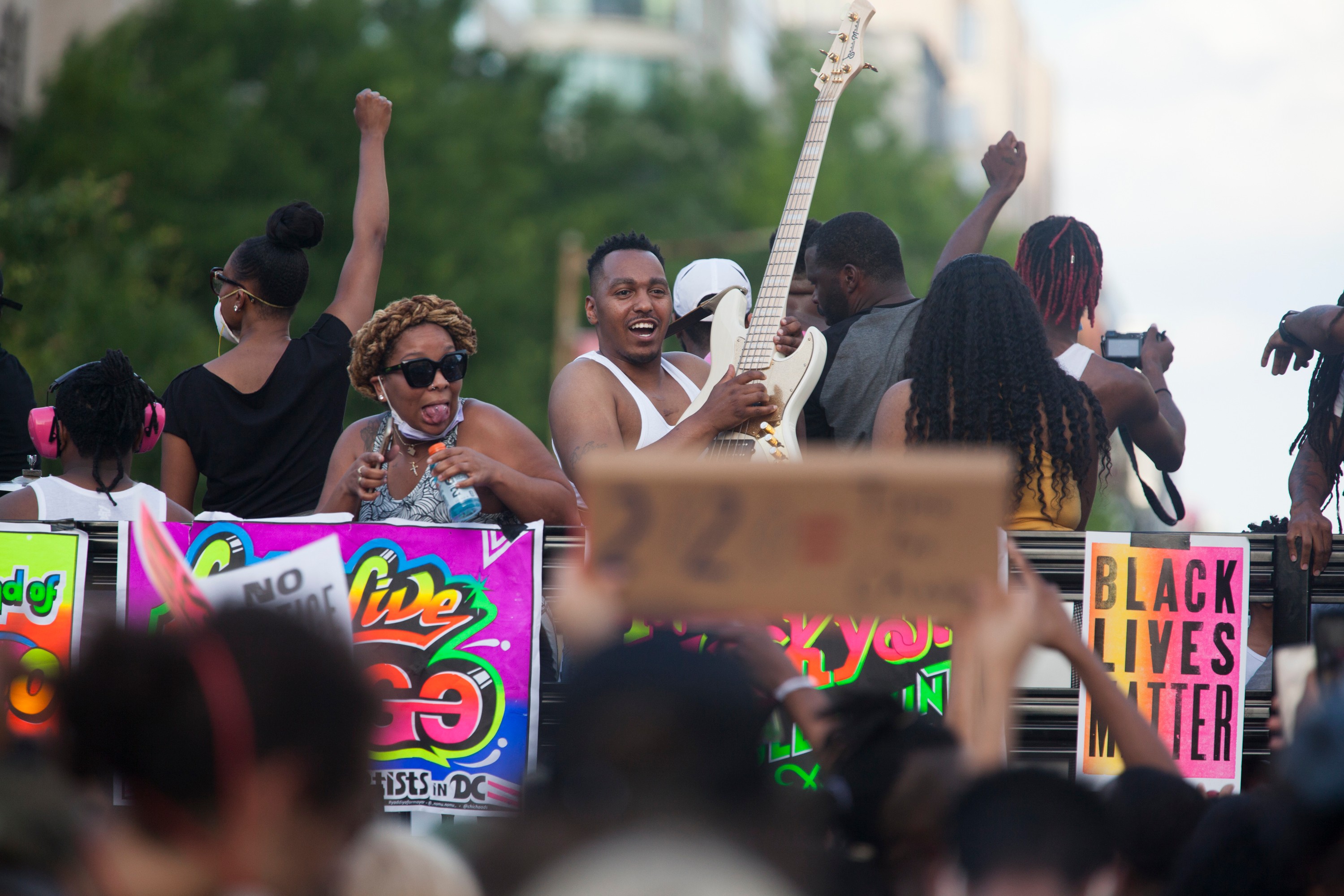 The protests against police brutality that began at the end of May following the police killing of George Floyd inspired a lasting racial justice movement that swept across America. Artists came to play a key role in the protests, especially here in D.C. By early June the fence surrounding the White House was covered in protest art. Go-go bands showed up on open-top buses to energize crowds. Music by local artists like OnRaé LaTeal of Arlington (above) provided a soundtrack with a social justice bent.