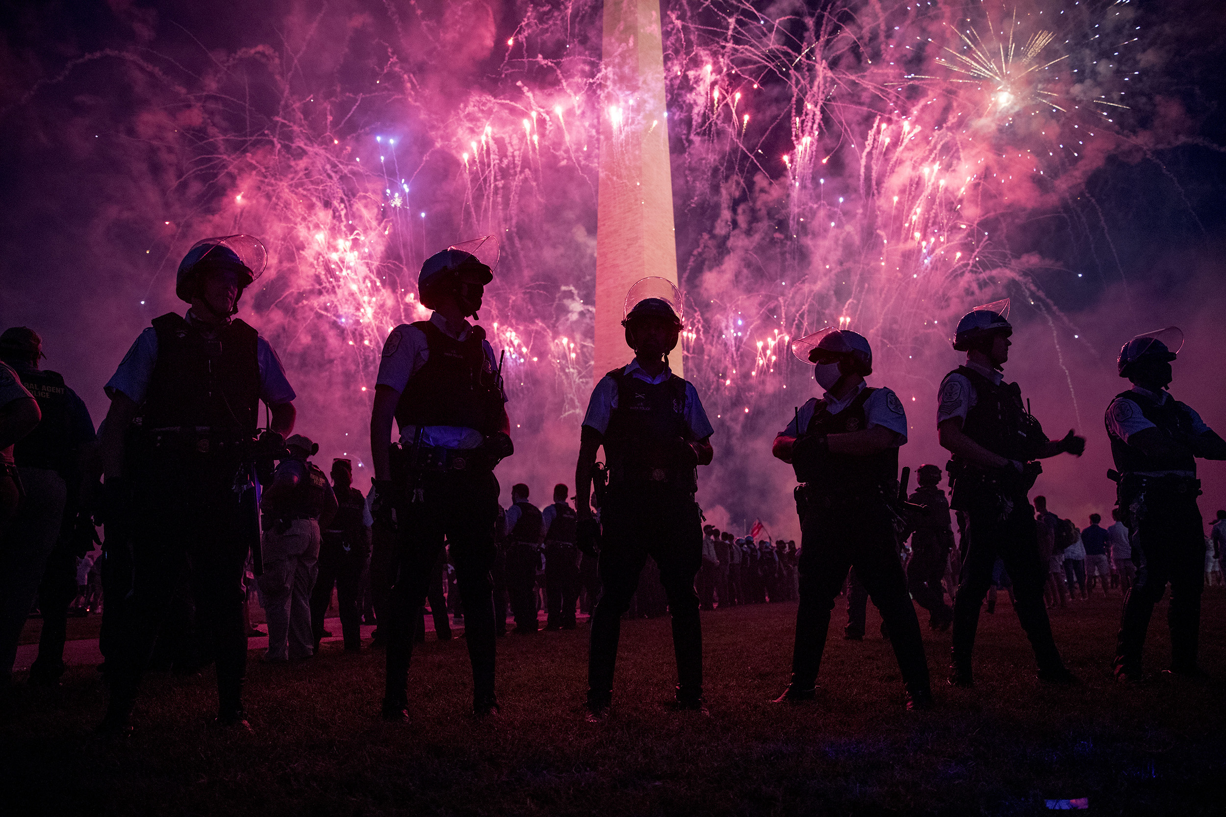 U.S. Park police stand separating a group of Black Lives Matter demonstrators and pro-Trump demonstrators on the National Mall as fireworks explode on July 4th.