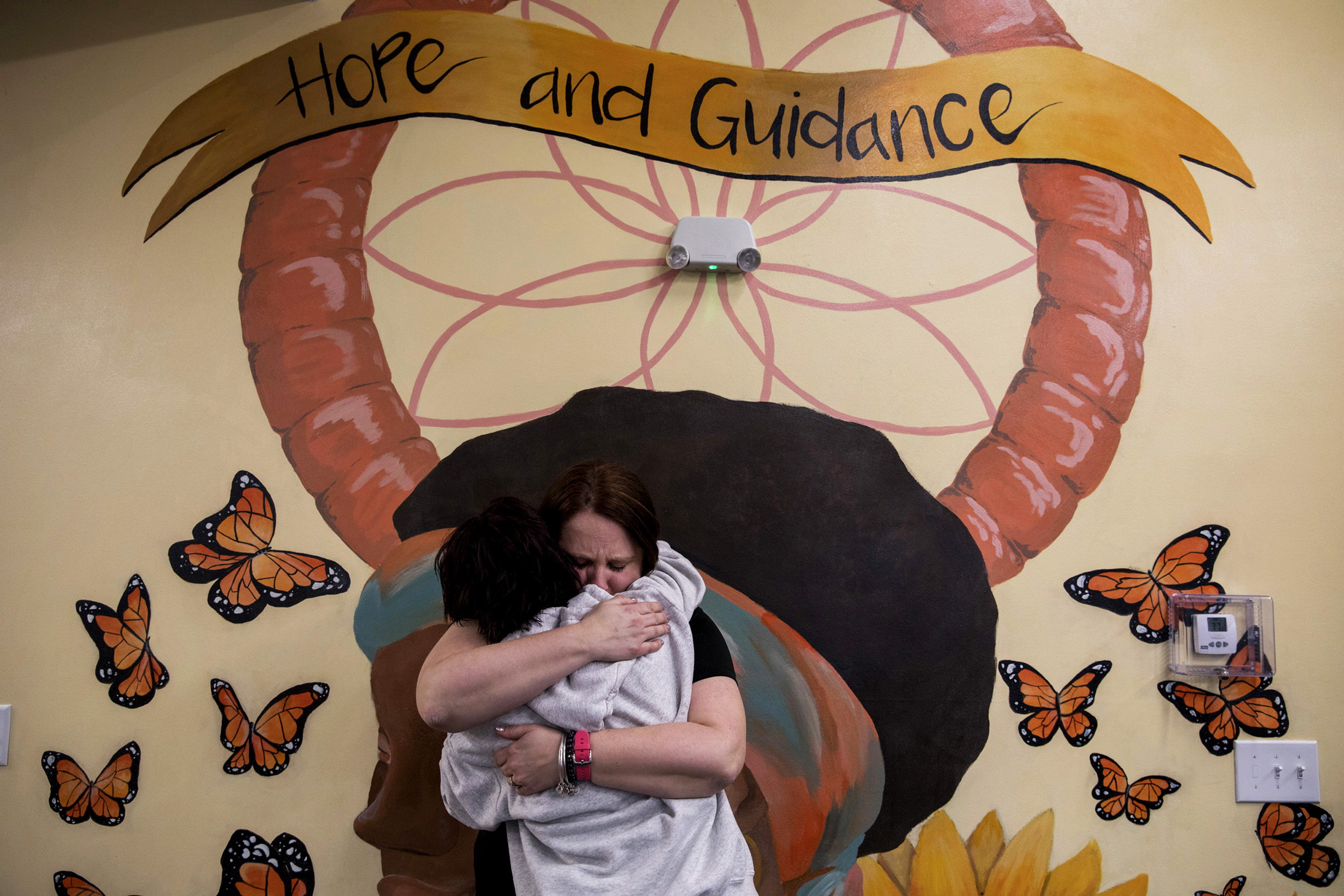 Jenn McLucas (facing camera) embraces resident Nichole Schuster after the first graduation ceremony at Brooke’s House in January 2020. McLucas serves as the clinical director for the long-term addiction treatment facility in Hagerstown, Md.