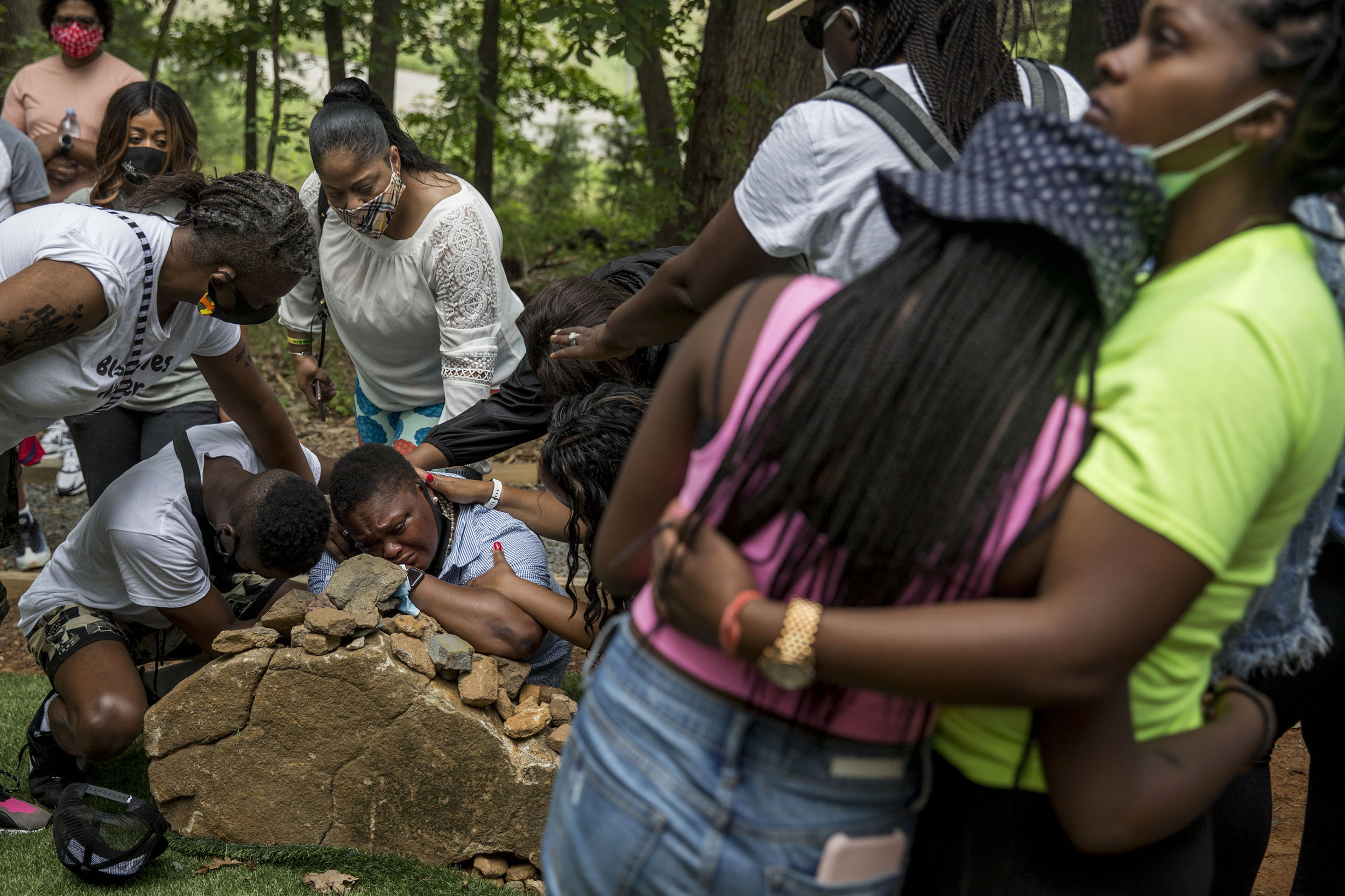 Surrounded by loved ones, Pastor Michelle Thomas grieves at the stone marking her son’s grave at the African American Burial Ground for the Enslaved at Belmont near Leesburg, Va. Her son, Fitz Alexander Campbell Thomas, 16, died in June and is the first free African American to be buried at the site.