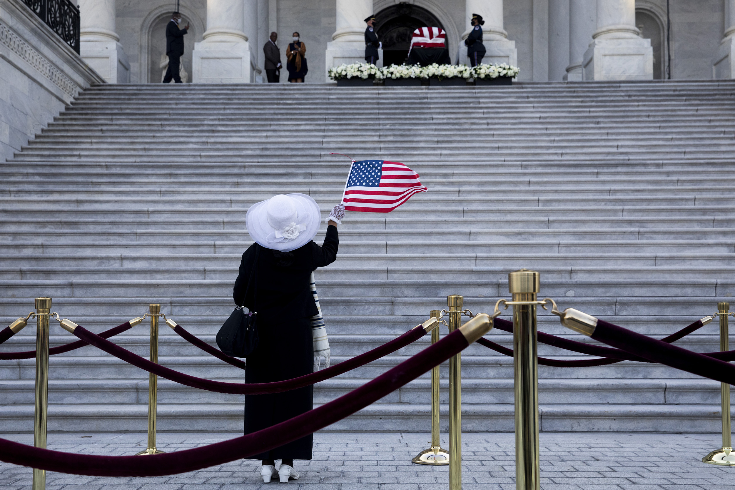 D.C. mourned two national political icons who died in 2020: civil rights icon and longtime Congressman John Lewis and Supreme Court Justice Ruth Bader Ginsburg. Thousands came to the steps of the U.S. Capitol and the Supreme Court to pay their respects to both Lewis and Ginsburg. In this photo, Evangelist Mary Clement of Silver Spring, Md., waves an American flag as she looks up at Lewis’s casket.
