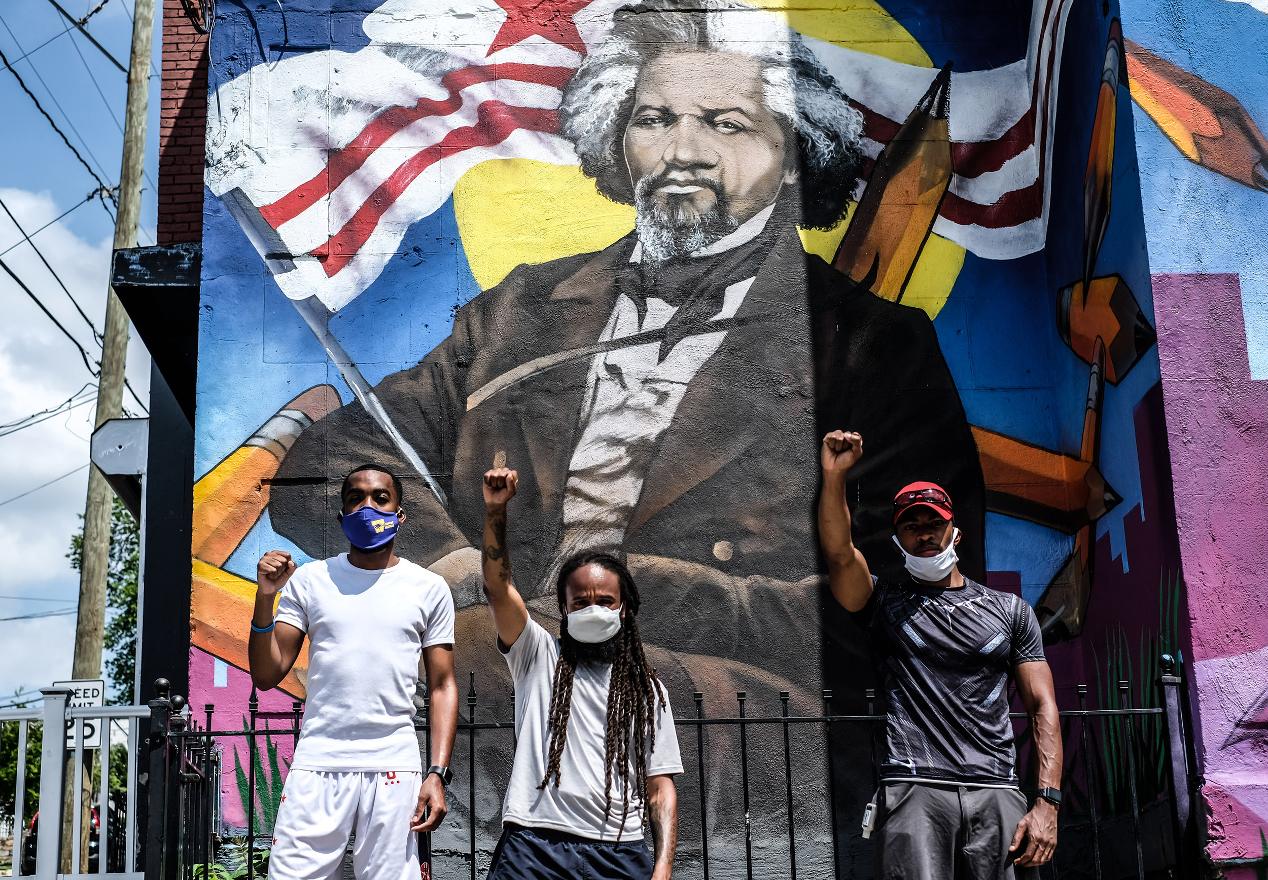 Charles Gussom Jr., assistant director of Martha’s Table, community council member Joe Houston and volunteer Dominic Rowe stand outside a mural of abolitionist Frederick Douglass. They passed out grocery bags to underserved communities in Southeast, D.C. during the pandemic.