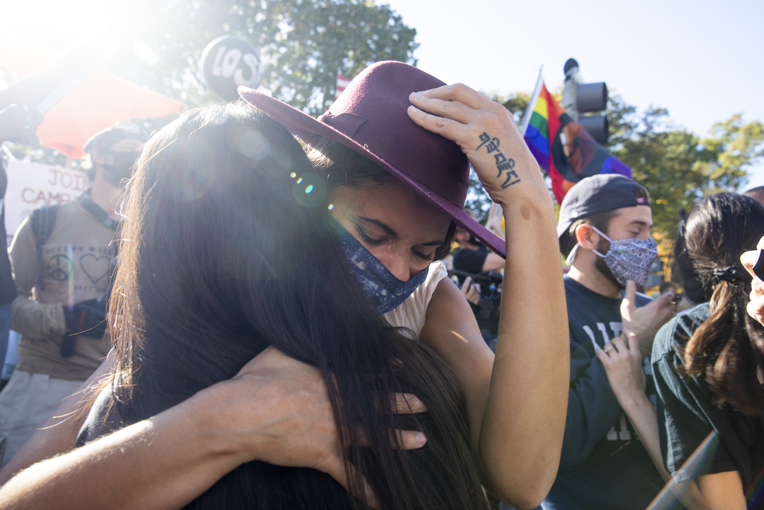 Crowds flocked to Black Lives Matter Plaza on Nov. 7 as Joseph Biden and Kamala Harris were declared victors of the 2020 presidential election. In this photo, D.C. residents Tessa Velasquez and Yera Park embrace during celebrations of Biden and Harris’ victory in downtown D.C.