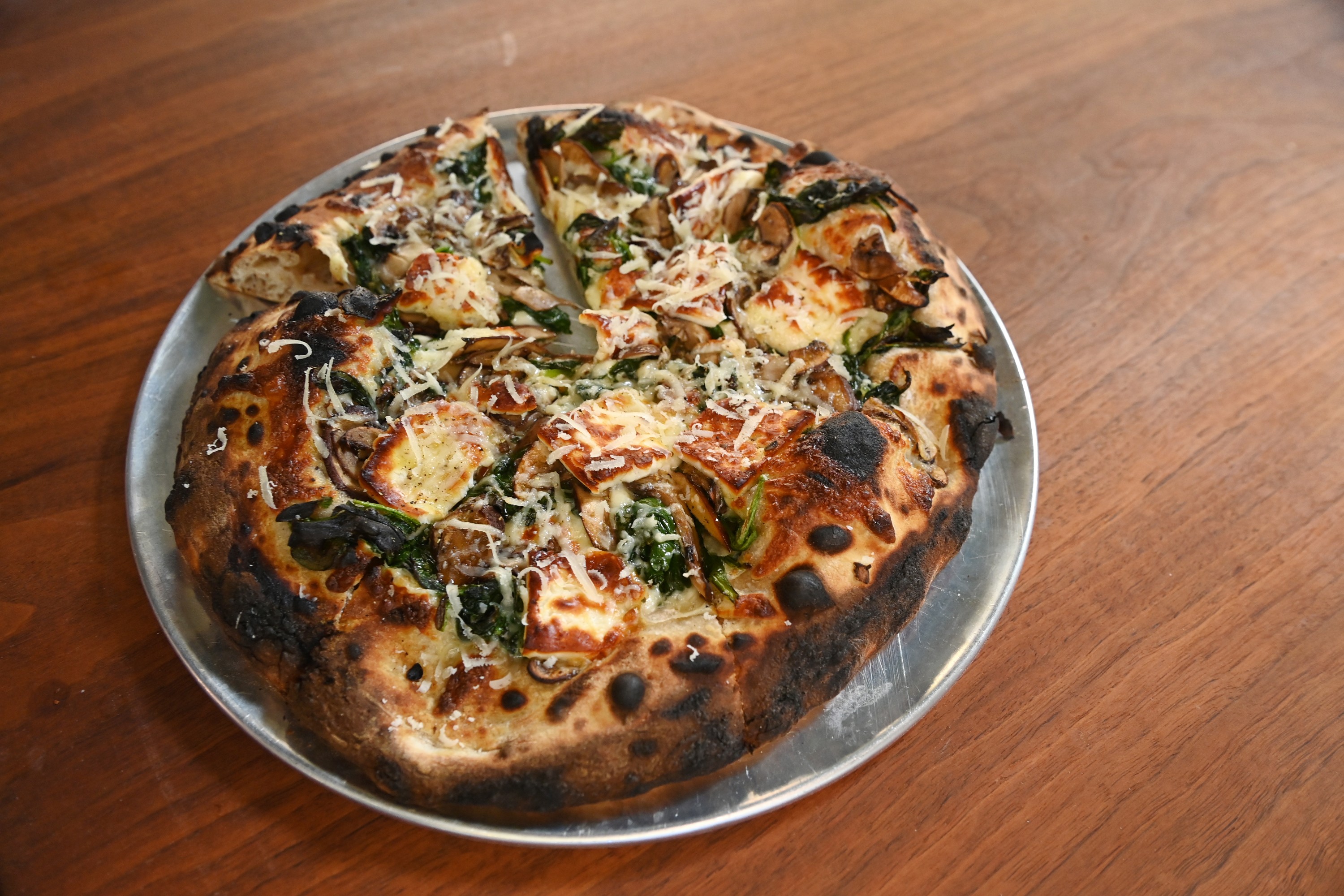 Specialty pizzas vary, based on the seasonal availability of ingredients and the chef’s whims. Recent offerings nodded to the chef’s Greek roots. One featured halloumi cheese, scamorza cheese (a relative of mozzarella), mushrooms, spinach, and lemon; another came with Kalamata olives and melted white onions.