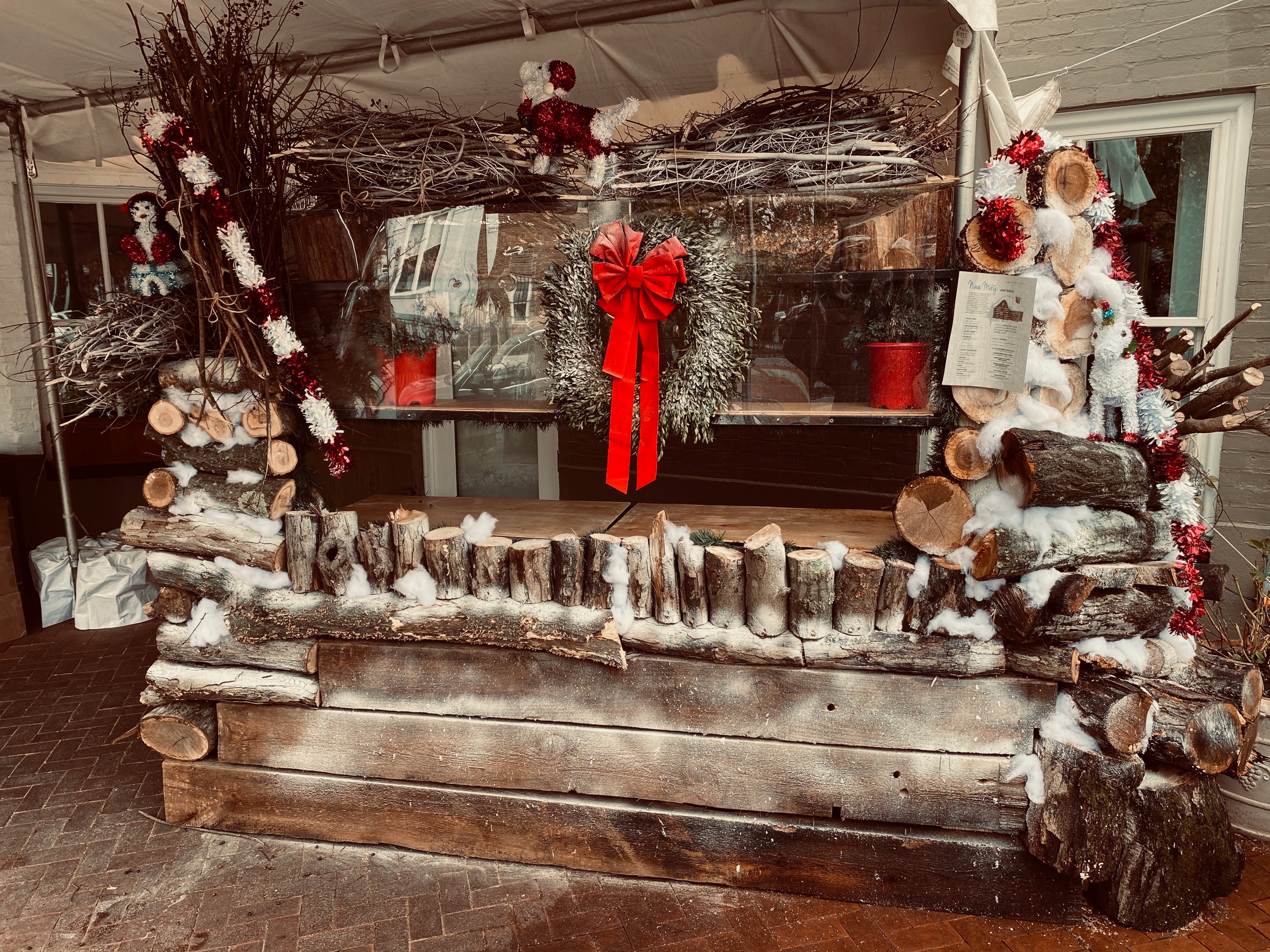 The idea stemmed from McClimans’ memories with his family in Canada, visiting the so-called sap houses where maple syrup is made and meals are shared around big tables. “You go sleigh riding, you bring the kids — that’s what I really missed,” he says. “Obviously you don’t go and sit at a communal table any more, but we tried to recreate that.” To do so, they built a cabin setup for their outdoor bar using logs from McClimans’ parents property, and set up a tent with firepits and heaters.