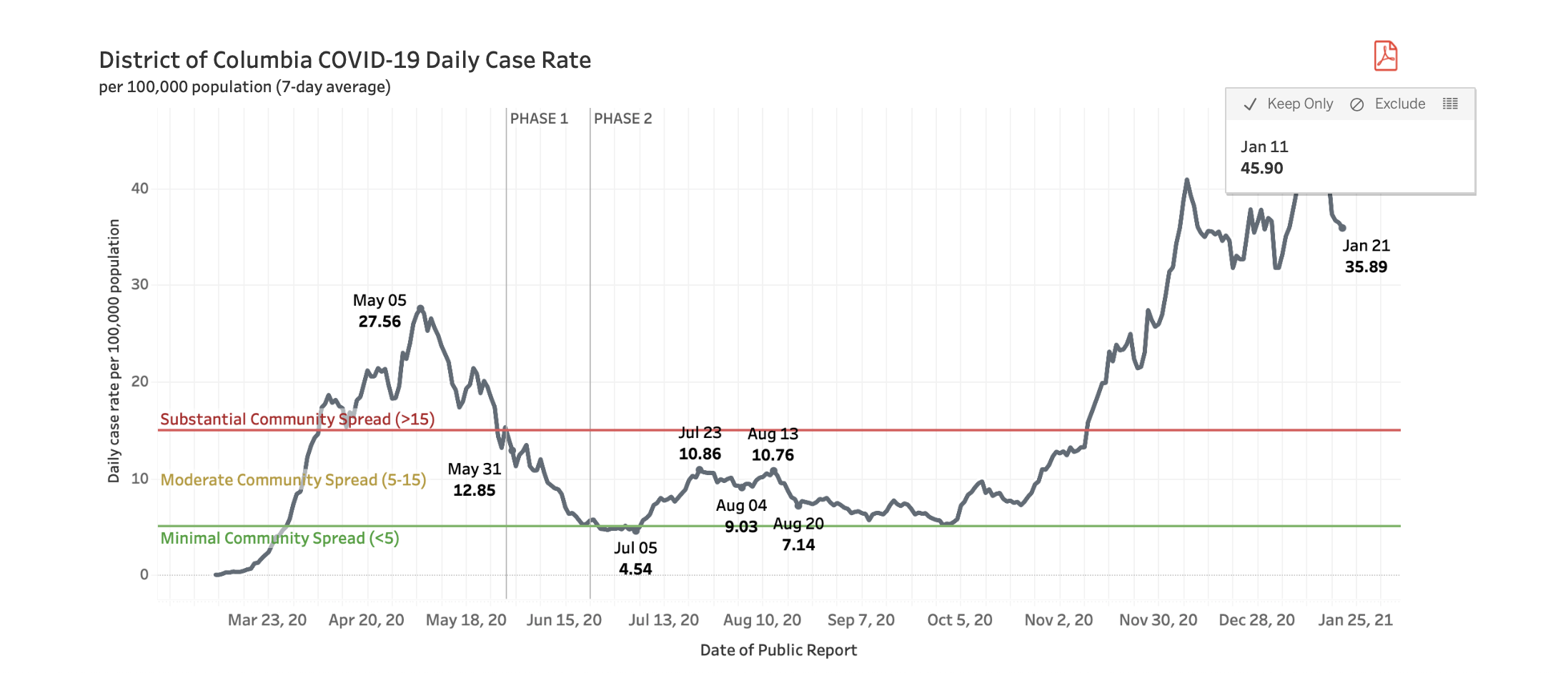 The daily case rate in D.C. has seen a marked decline from a new peak set on January 1, even as it remains well above the height of the spring numbers.