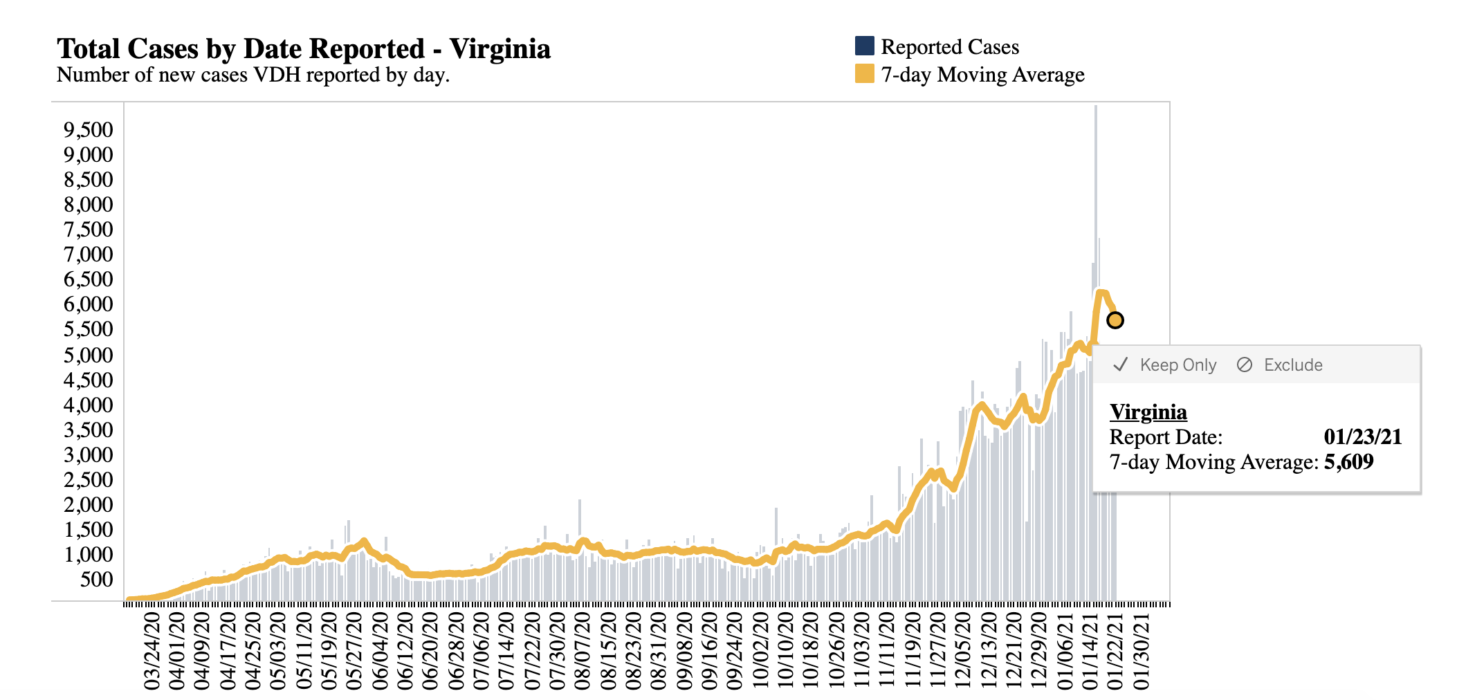 In Virginia, which recorded a staggering 10,000 new COVID-19 cases in a single day last Sunday, the rolling average of new cases has decreased over the past week.