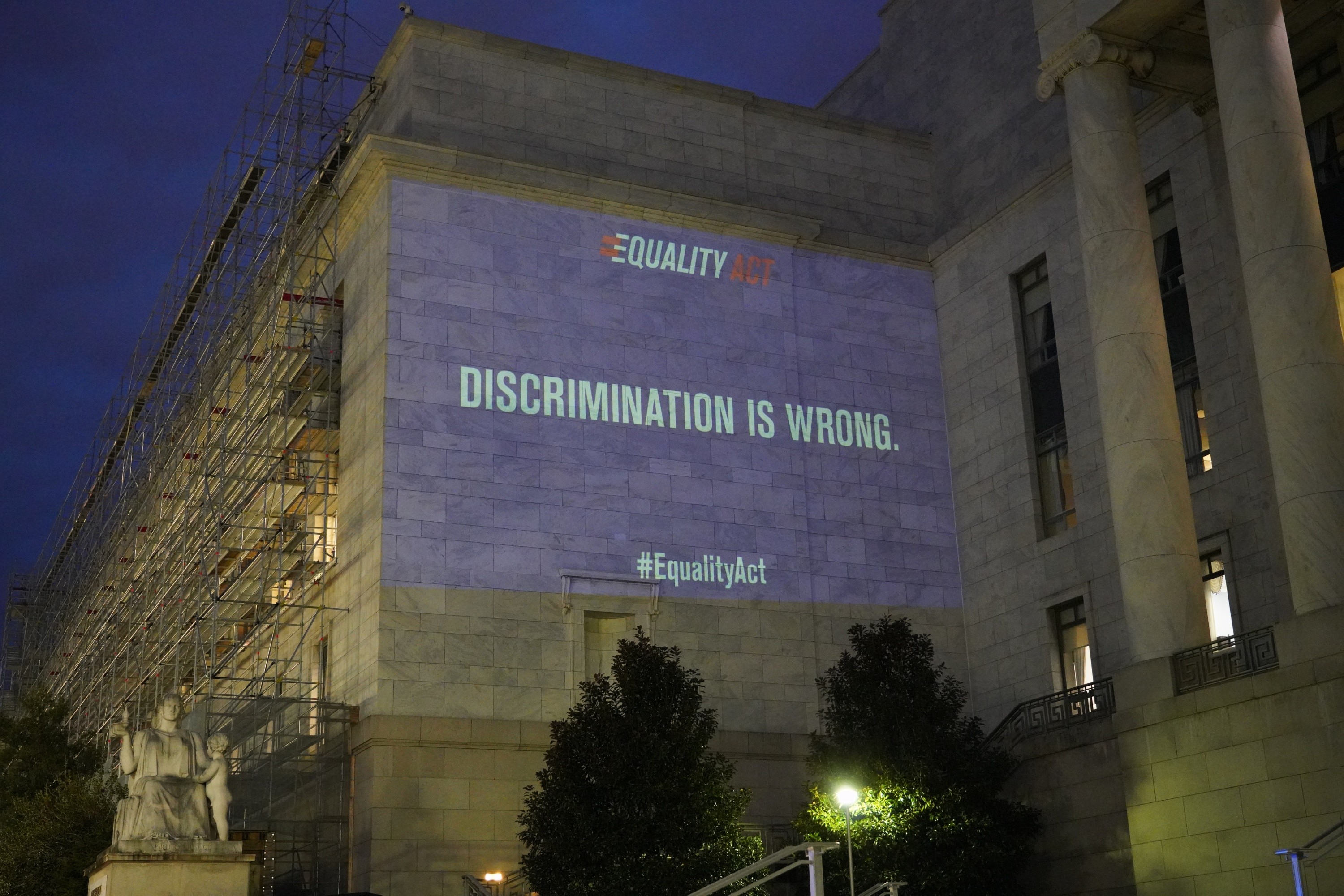 Looking back, Bell feels a deep sense of relief that he and his team never faced any serious challenges to their safety from out-of-town Trump supporters staying at the Trump Hotel. One of his collaborators was arrested in March 2019 while Bell was projecting “DISCRIMINATION IS WRONG” onto the Rayburn House Office Building as part of a project supporting LGBTQ+ equality. The charges were eventually dropped, which Bell credits to the media attention the arrest received.